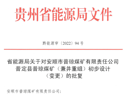 安順市普瓊煤礦有限責(zé)任公司普定縣普瓊煤礦(兼并重組)初步設(shè)計(變更)
