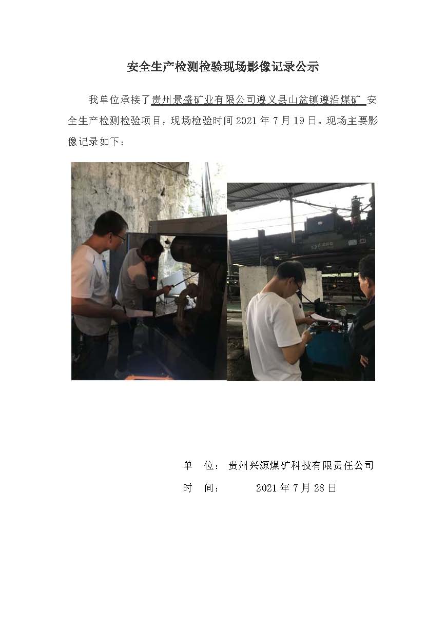 安全生產(chǎn)檢測檢驗(yàn)現(xiàn)場影像記錄公示【貴州景盛礦業(yè)有限公司遵義縣山盆鎮(zhèn)遵沿煤礦】