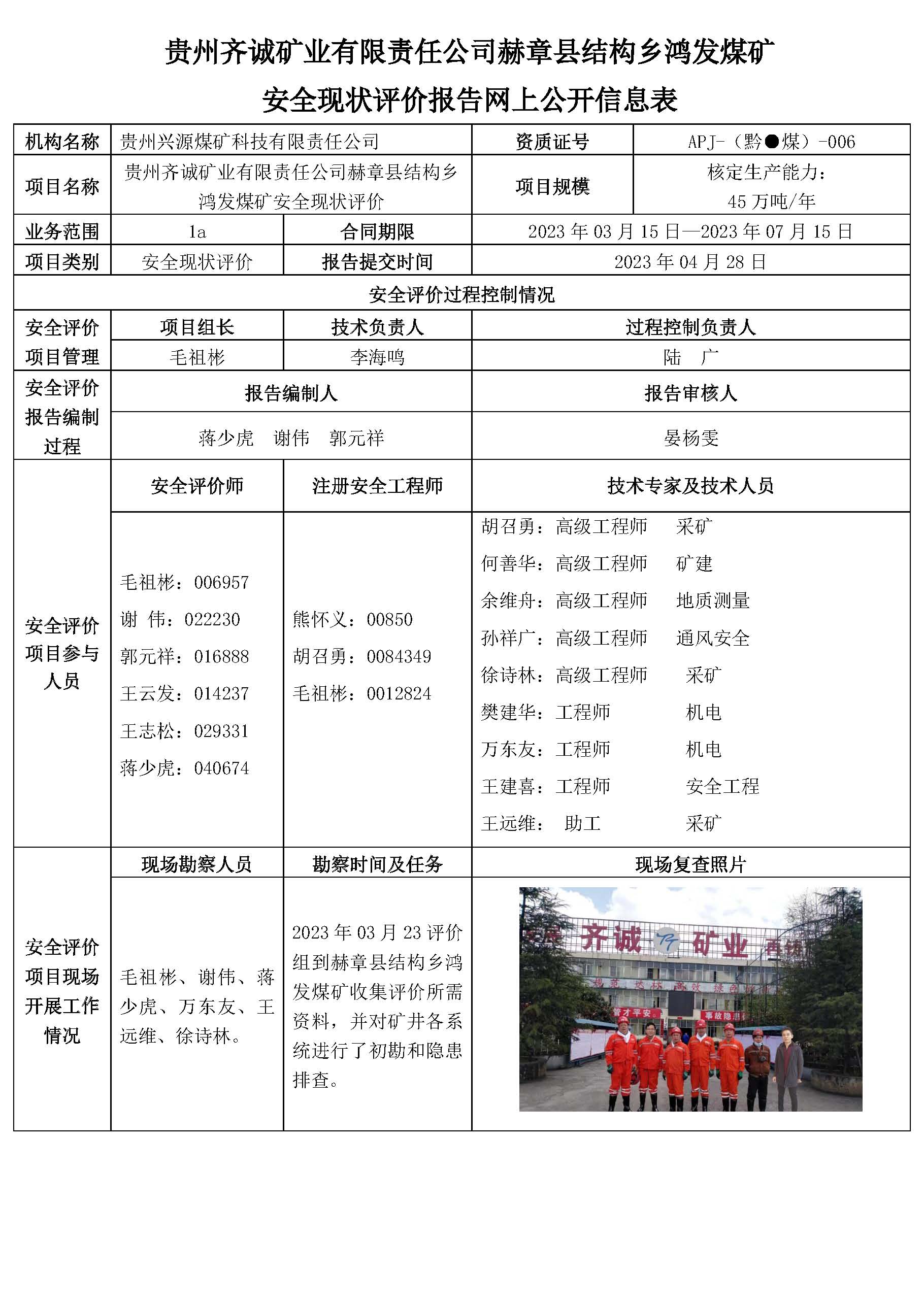 貴州齊誠礦業(yè)有限責(zé)任公司赫章縣結(jié)構(gòu)鄉(xiāng)鴻發(fā)煤礦 安全現(xiàn)狀評價報(bào)告網(wǎng)上公開信息表