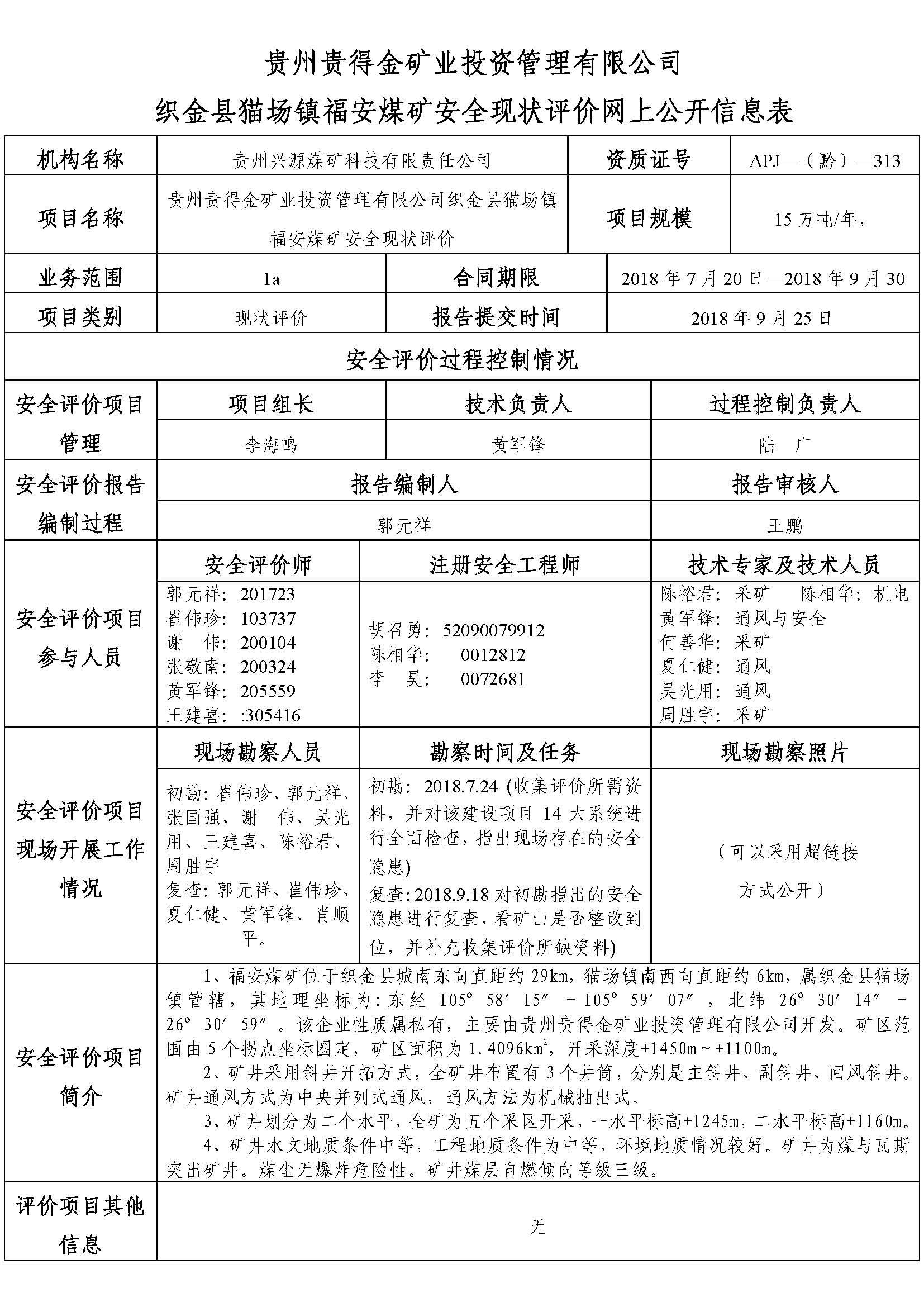 貴州貴得金礦業(yè)投資管理有限公司織金縣貓場鎮(zhèn)福安煤礦安全現(xiàn)狀評價網(wǎng)上公開信息表