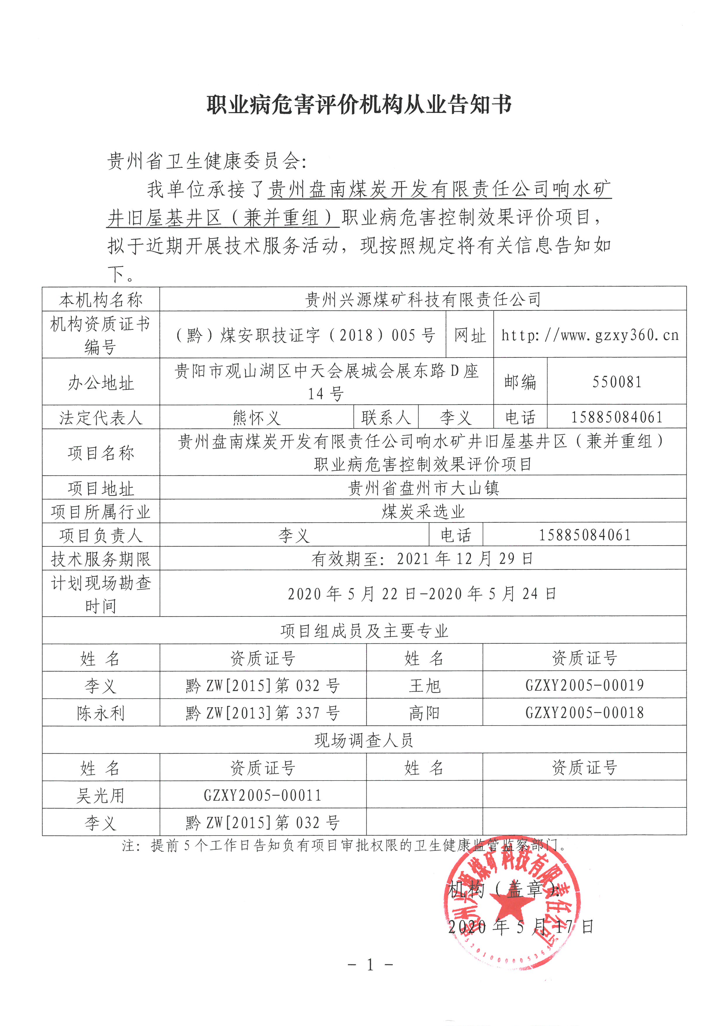 職業(yè)病危害評(píng)價(jià)機(jī)構(gòu)從業(yè)告知書【貴州盤南煤炭開發(fā)有限責(zé)任公司響水礦井舊屋基井區(qū)(兼并重組)】
