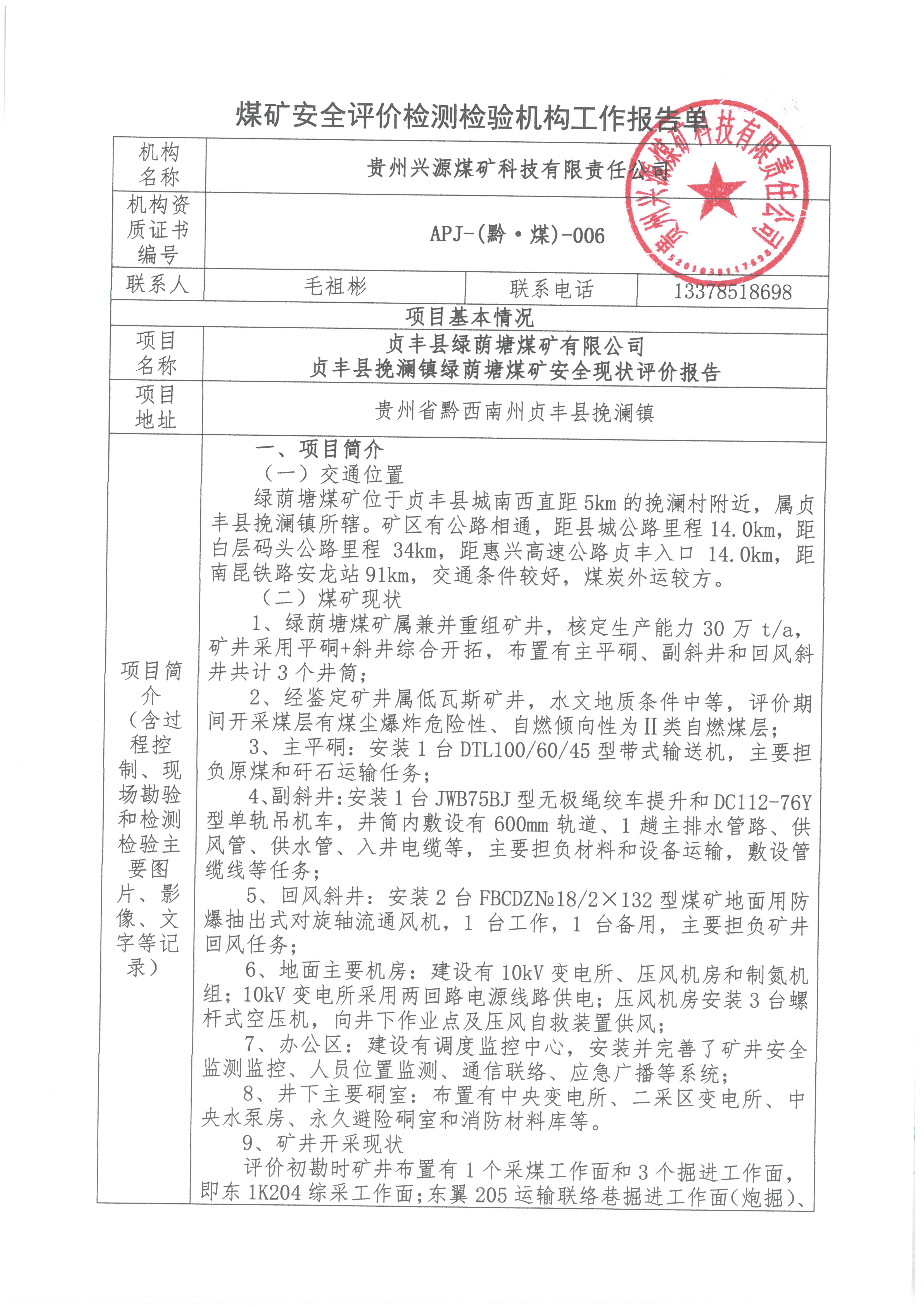 煤礦安全評(píng)價(jià)檢測檢驗(yàn)機(jī)構(gòu)工作報(bào)告單【貞豐縣綠蔭塘煤礦有限公司貞豐縣挽瀾鎮(zhèn)綠蔭塘煤礦安全現(xiàn)狀評(píng)價(jià)報(bào)告】