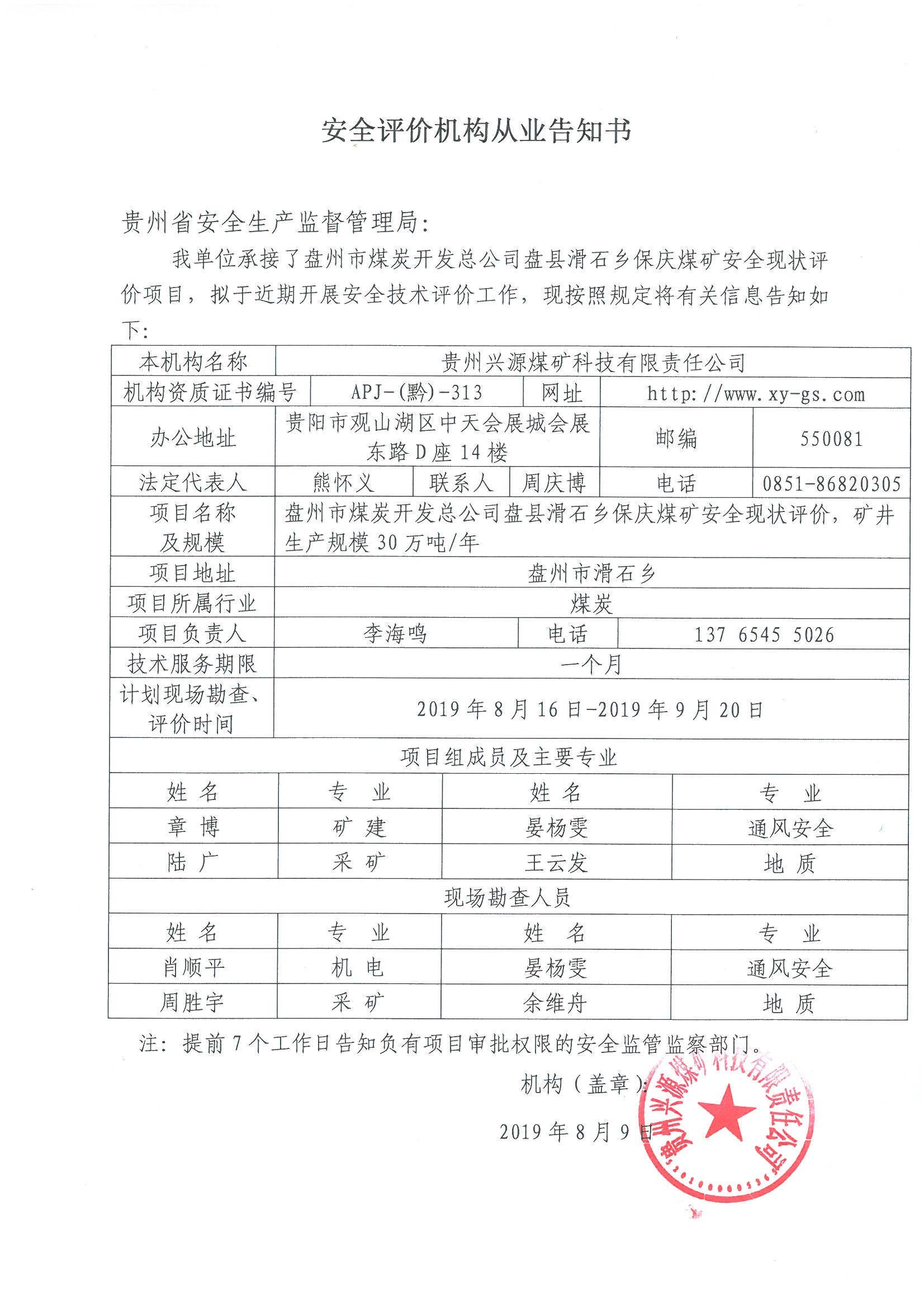 安全評價機(jī)構(gòu)從業(yè)告知書(貴州黔西能源開發(fā)有限公司貴州省黔西縣青龍煤礦)