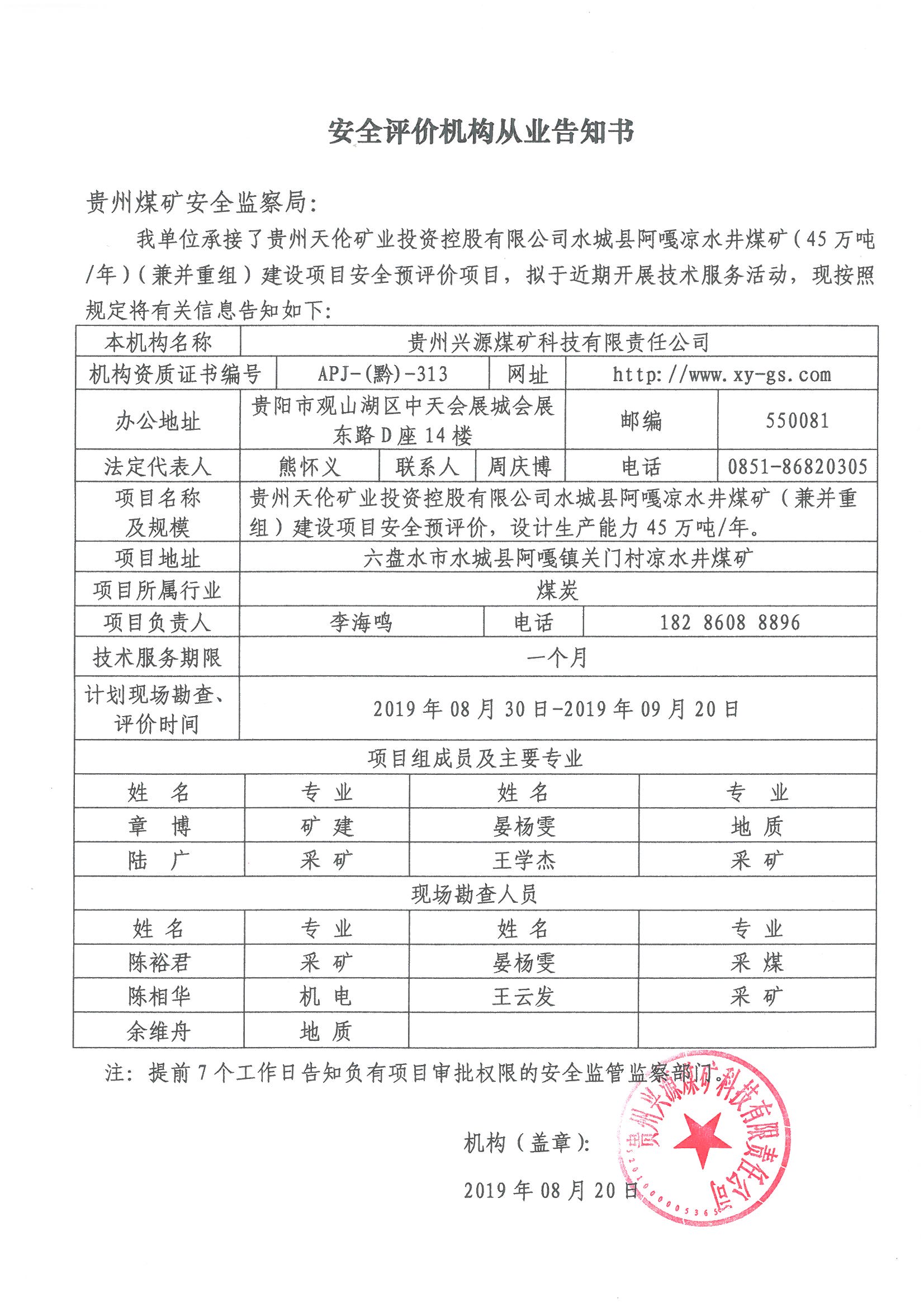 安全評價機構(gòu)從業(yè)告知書[貴州天倫礦業(yè)投資控股有限公司水城縣阿嘎涼水井煤礦]