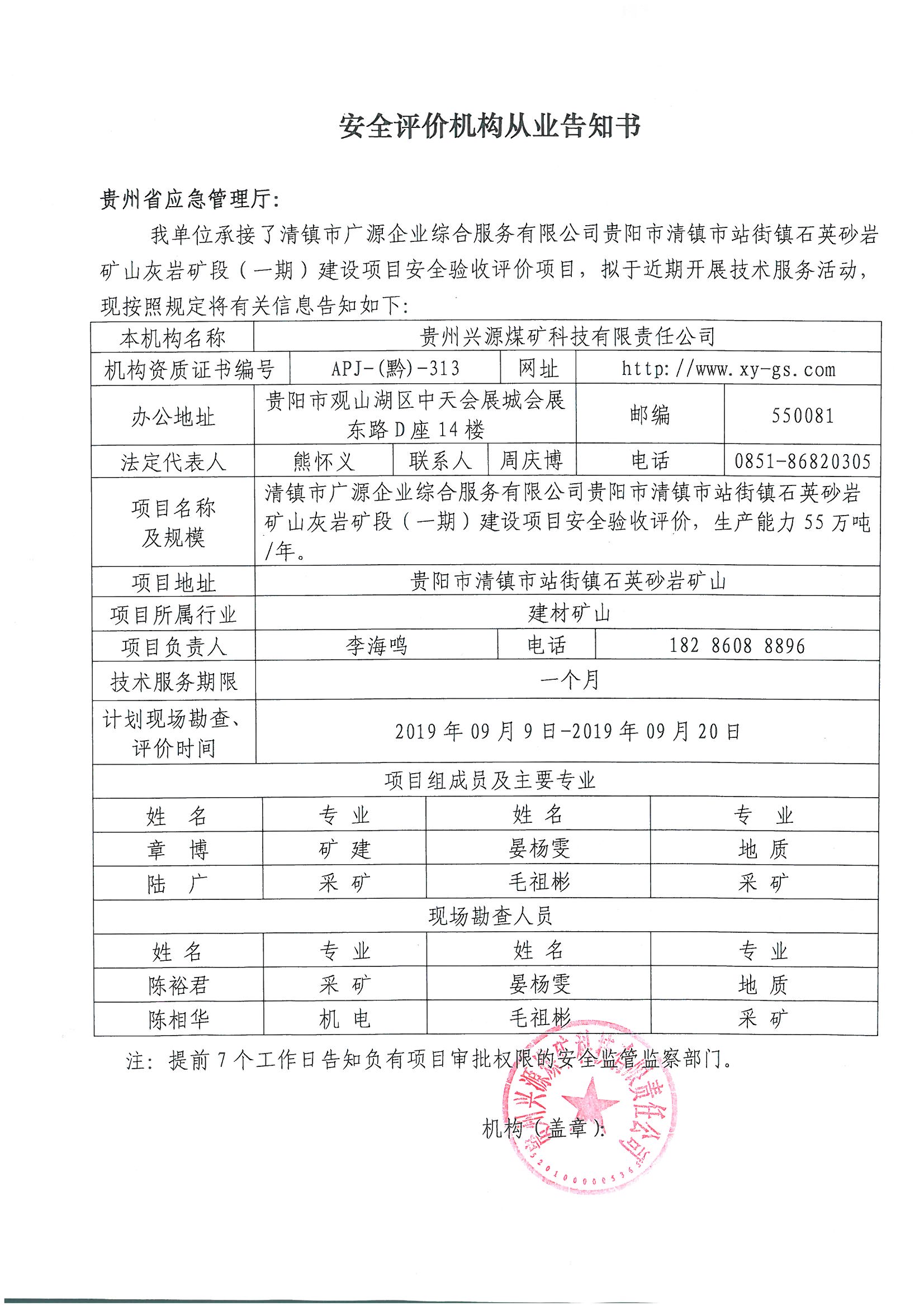 安全評價機構(gòu)從業(yè)告知書【清鎮(zhèn)市廣源企業(yè)綜合服務(wù)有限公司貴陽市清鎮(zhèn)市站街鎮(zhèn)石英砂巖礦山灰?guī)r礦段(一)期建設(shè)項目】