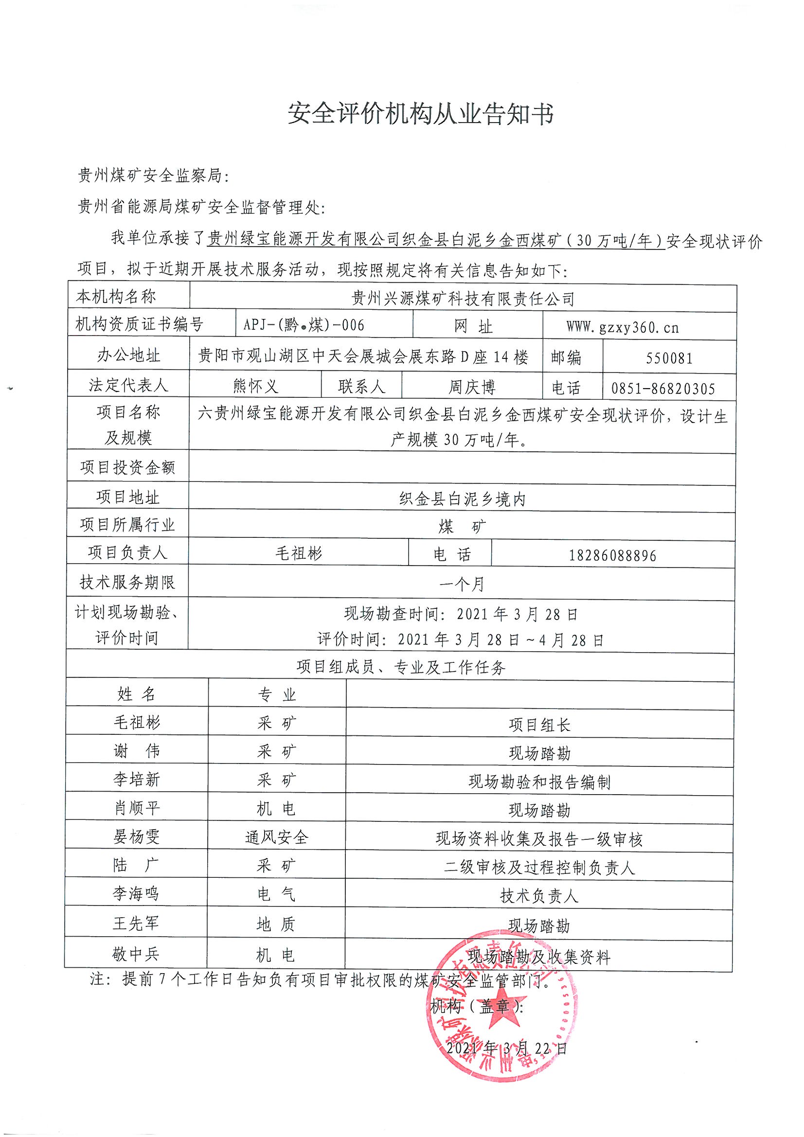 安全評價機構(gòu)從業(yè)告知書(貴州綠寶能源開發(fā)有限公司織金縣白泥鄉(xiāng)金西煤礦)