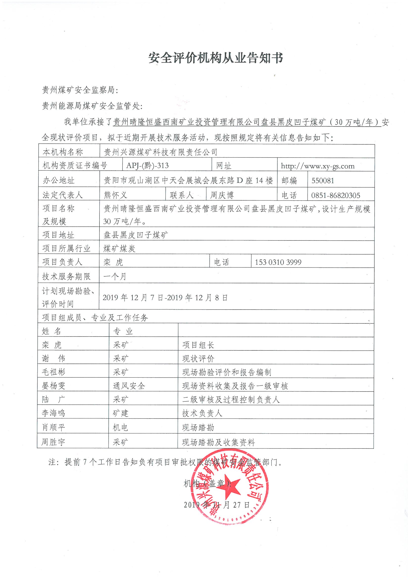 安全評價(jià)機(jī)構(gòu)從業(yè)告知書[貴州晴隆恒盛西南礦業(yè)投資管理有限公司盤縣黑皮凹子煤礦(30萬噸/年)安全現(xiàn)狀評價(jià)]