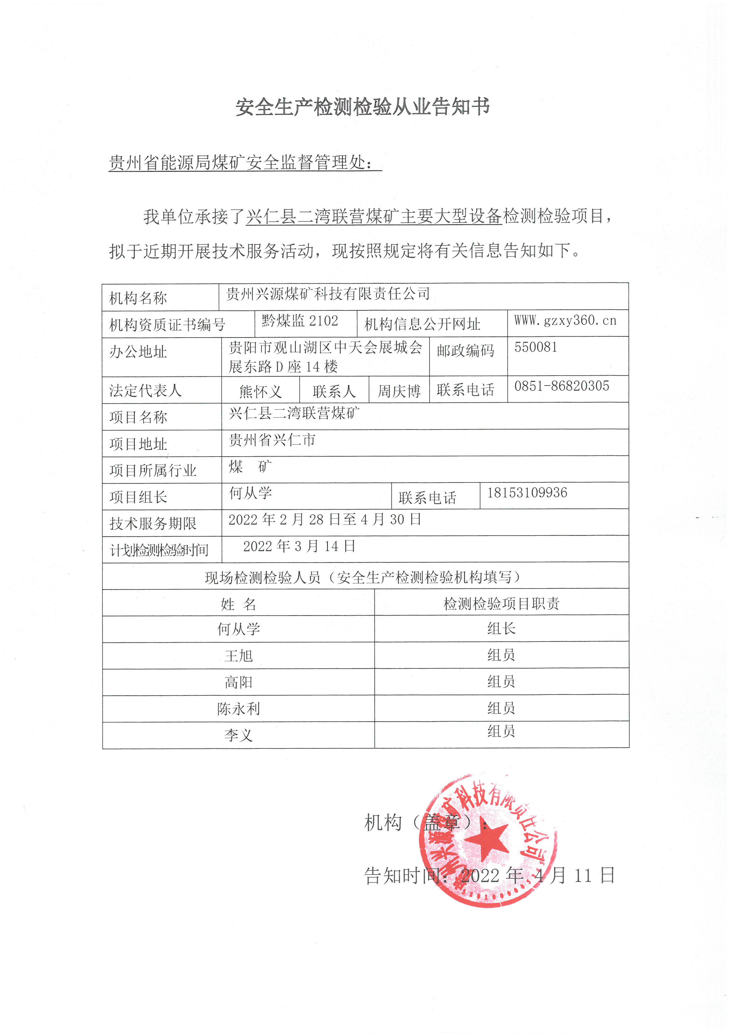 安全生產(chǎn)檢測(cè)檢驗(yàn)從業(yè)告知書【興仁縣二灣聯(lián)營(yíng)煤礦主要大型設(shè)備檢測(cè)檢驗(yàn)項(xiàng)目】