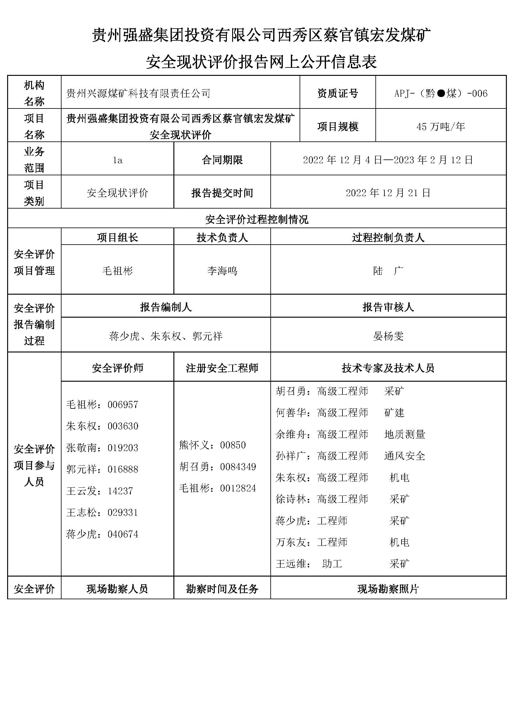 貴州強(qiáng)盛集團(tuán)投資有限公司西秀區(qū)蔡官鎮(zhèn)宏發(fā)煤礦安全現(xiàn)狀評(píng)價(jià)報(bào)告網(wǎng)上公開(kāi)信息表