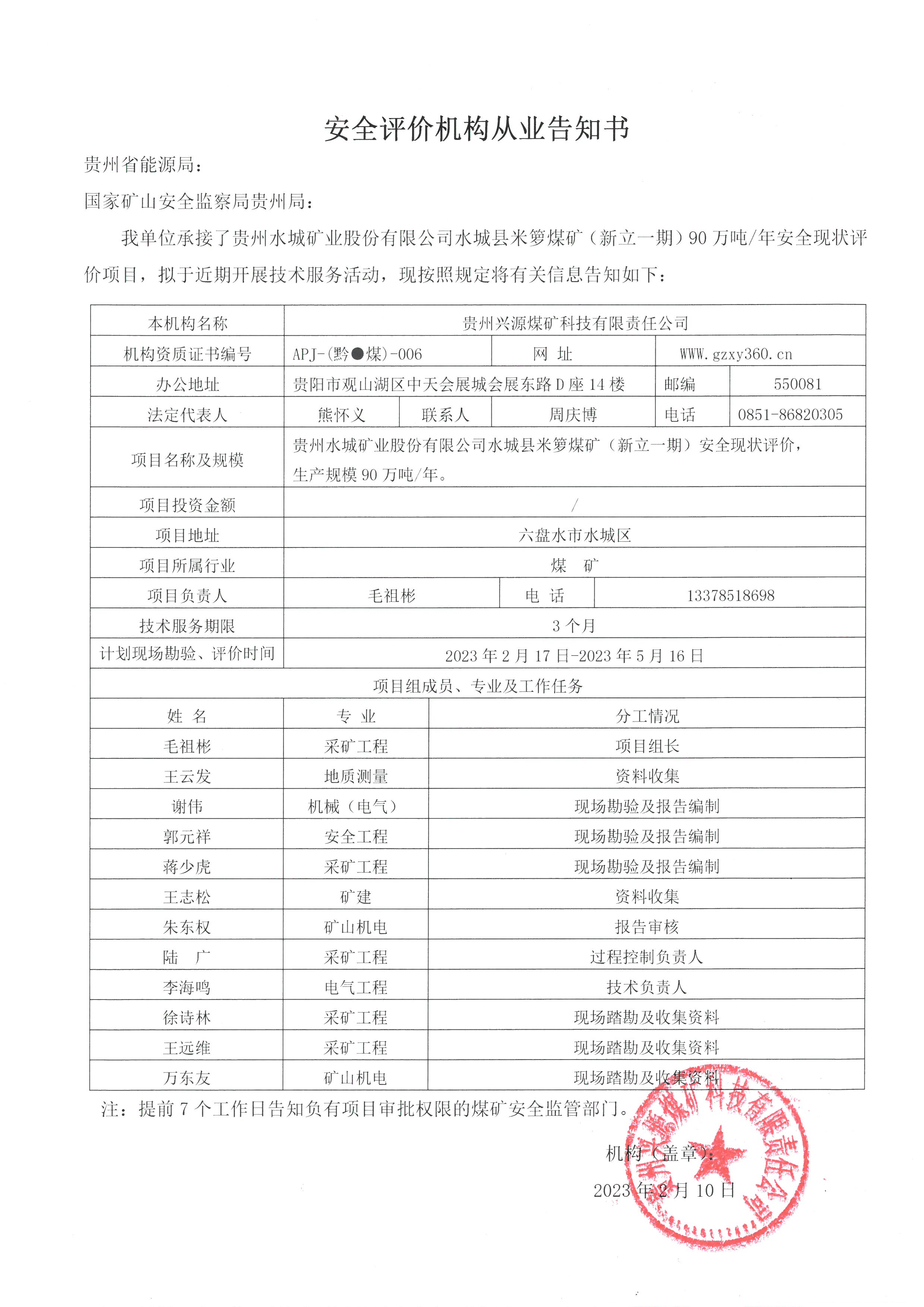 煤礦安全評(píng)價(jià)機(jī)構(gòu)從業(yè)告知書(shū)(貴州水城礦業(yè)股份有限公司水城縣米籮煤礦(新立一期))