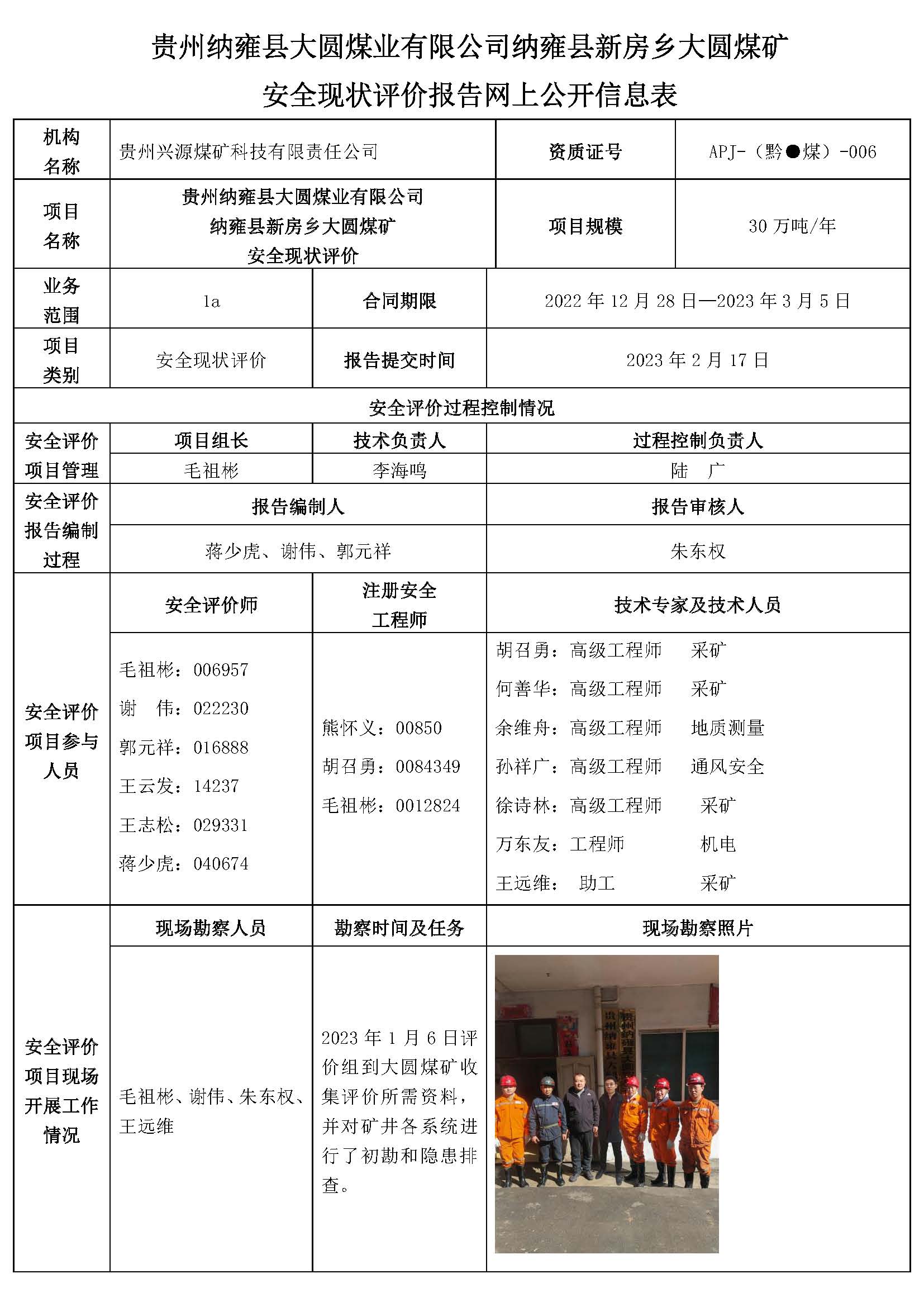 貴州納雍縣大圓煤業(yè)有限公司納雍縣新房鄉(xiāng)大圓煤礦 安全現(xiàn)狀評(píng)價(jià)報(bào)告網(wǎng)上公開(kāi)信息表