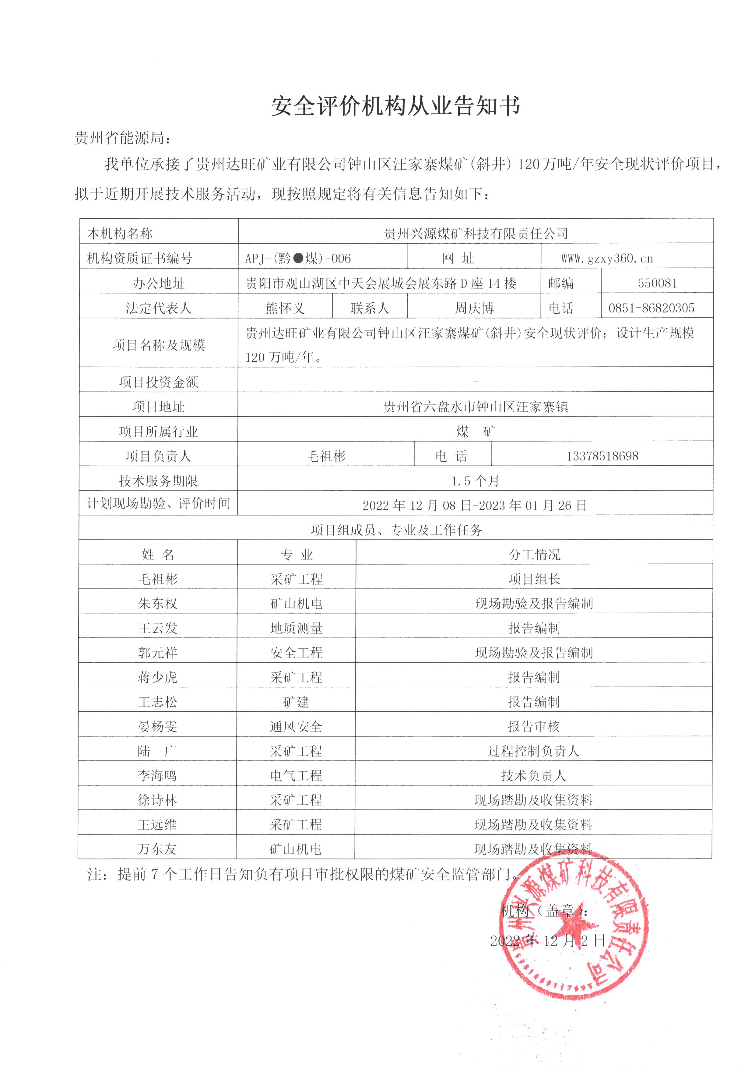安全評(píng)價(jià)機(jī)構(gòu)從業(yè)告知書(shū)【貴州達(dá)旺礦業(yè)有限公司鐘山區(qū)汪家寨煤礦(斜井)】