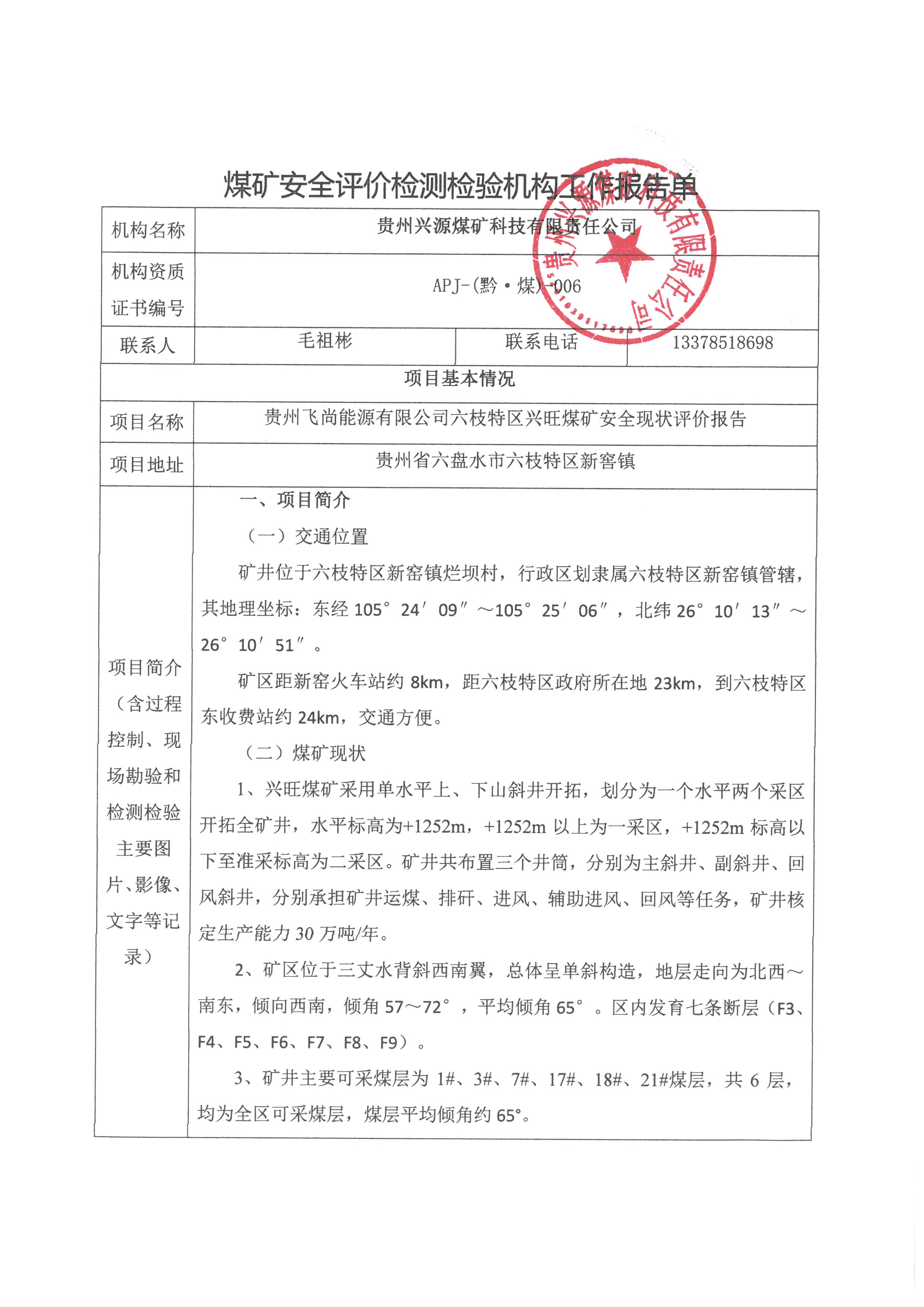 煤礦安全評價檢測檢驗機構(gòu)工作報告單【貴州飛尚能源有限公司六枝特區(qū)興旺煤礦安全現(xiàn)狀評價報告】