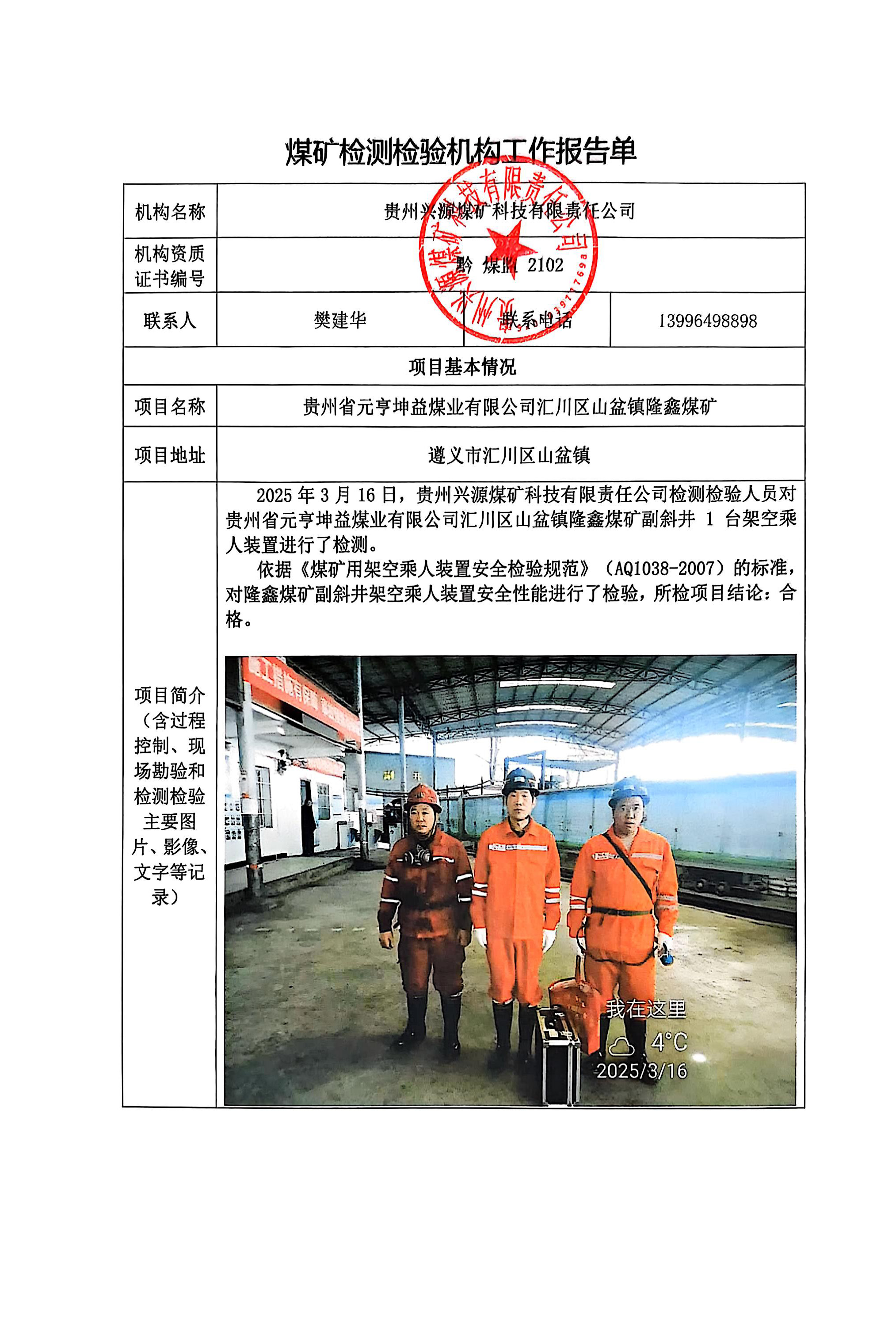 煤礦檢測檢驗機構(gòu)工作報告單【貴州省元亨坤益煤業(yè)有限公司匯川區(qū)山盆鎮(zhèn)隆鑫煤礦】