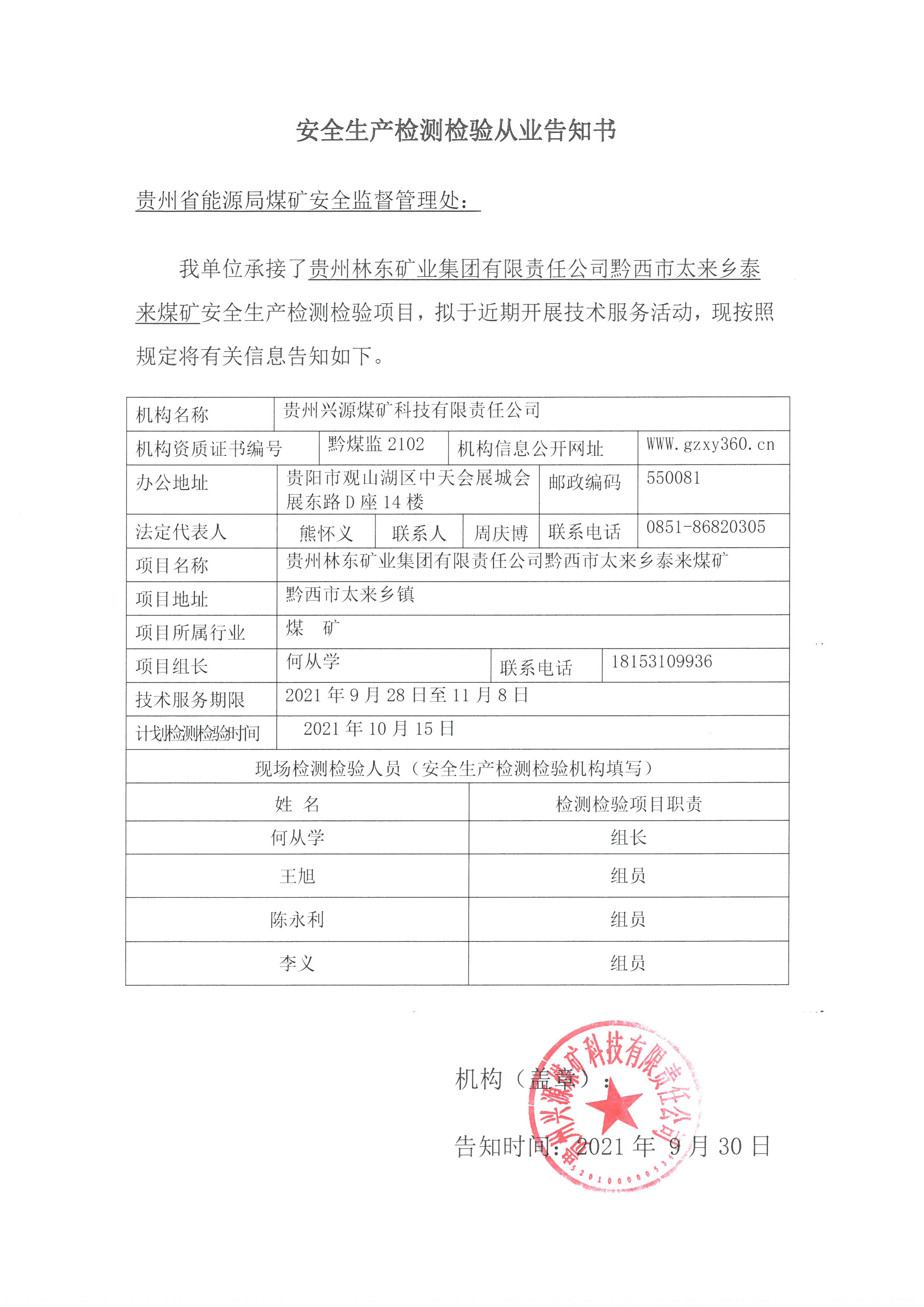 安全生產(chǎn)檢測檢驗從業(yè)告知書【貴州林東礦業(yè)集團(tuán)有限責(zé)任公司黔西市太來鄉(xiāng)泰來煤礦】