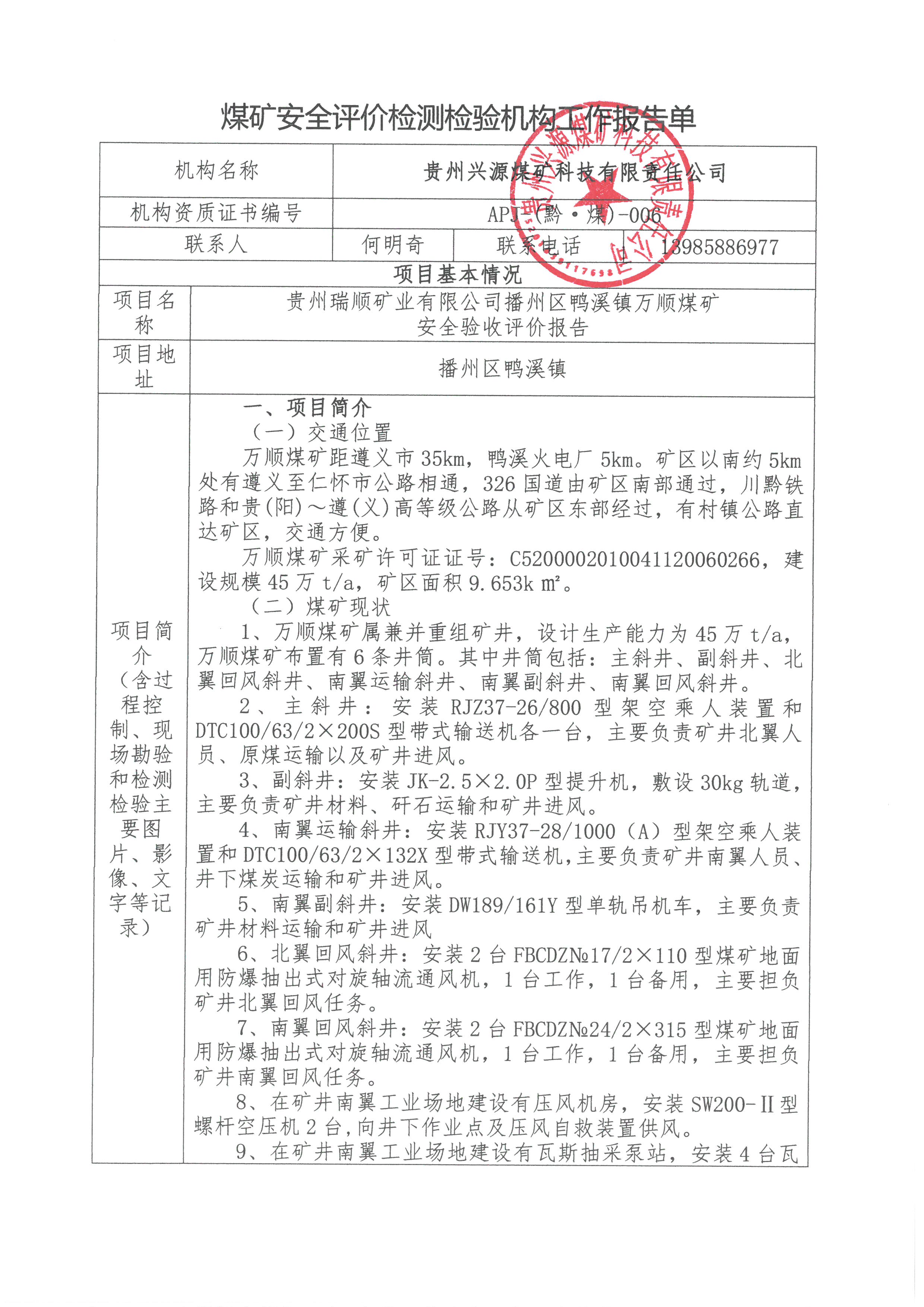 煤礦安全評價檢測檢驗機(jī)構(gòu)工作報告單【貴州瑞順礦業(yè)有限公司播州區(qū)鴨溪鎮(zhèn)萬順煤礦安全驗收評價報告】