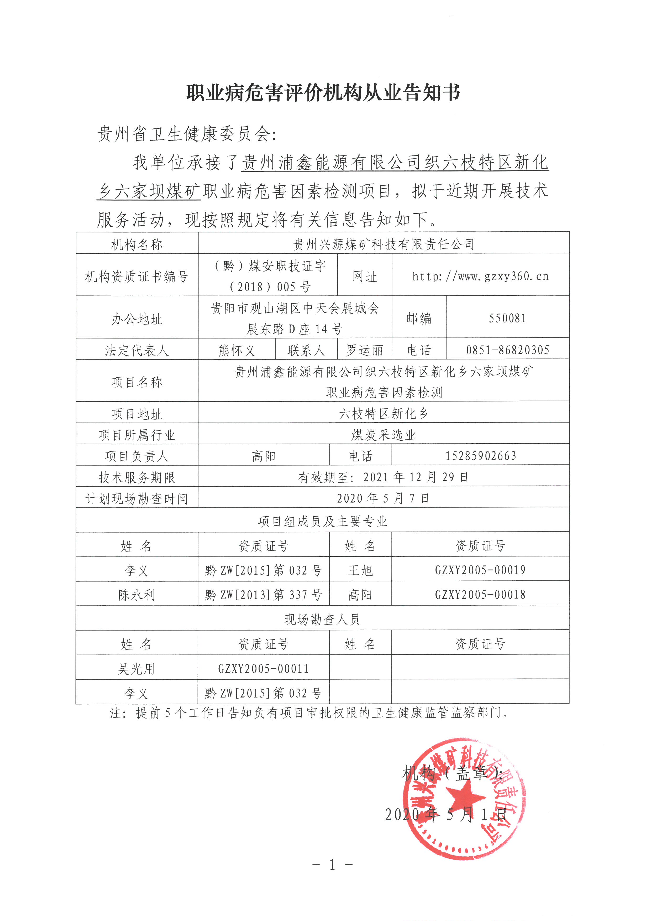 職業(yè)病危害評價機構(gòu)從業(yè)告知書[貴州浦鑫能源有限公司六枝特區(qū)新華鄉(xiāng)六家壩煤礦]