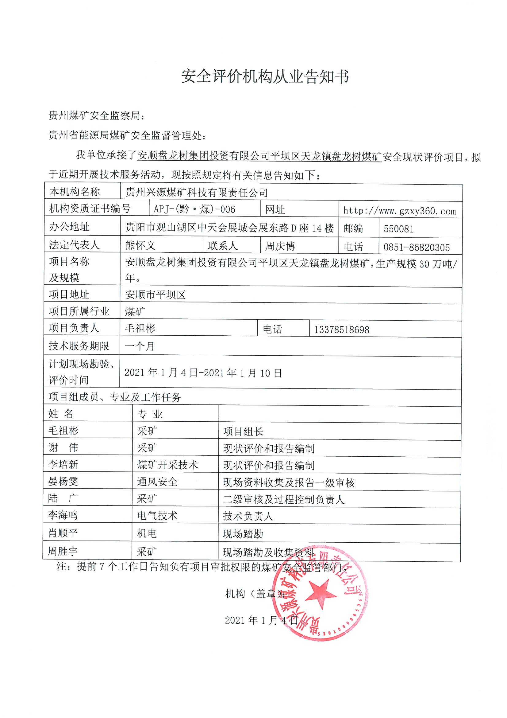 安全評(píng)價(jià)機(jī)構(gòu)從業(yè)告知書(安順盤龍樹集團(tuán)投資有限公司平壩區(qū)天龍鎮(zhèn)盤龍樹煤礦)