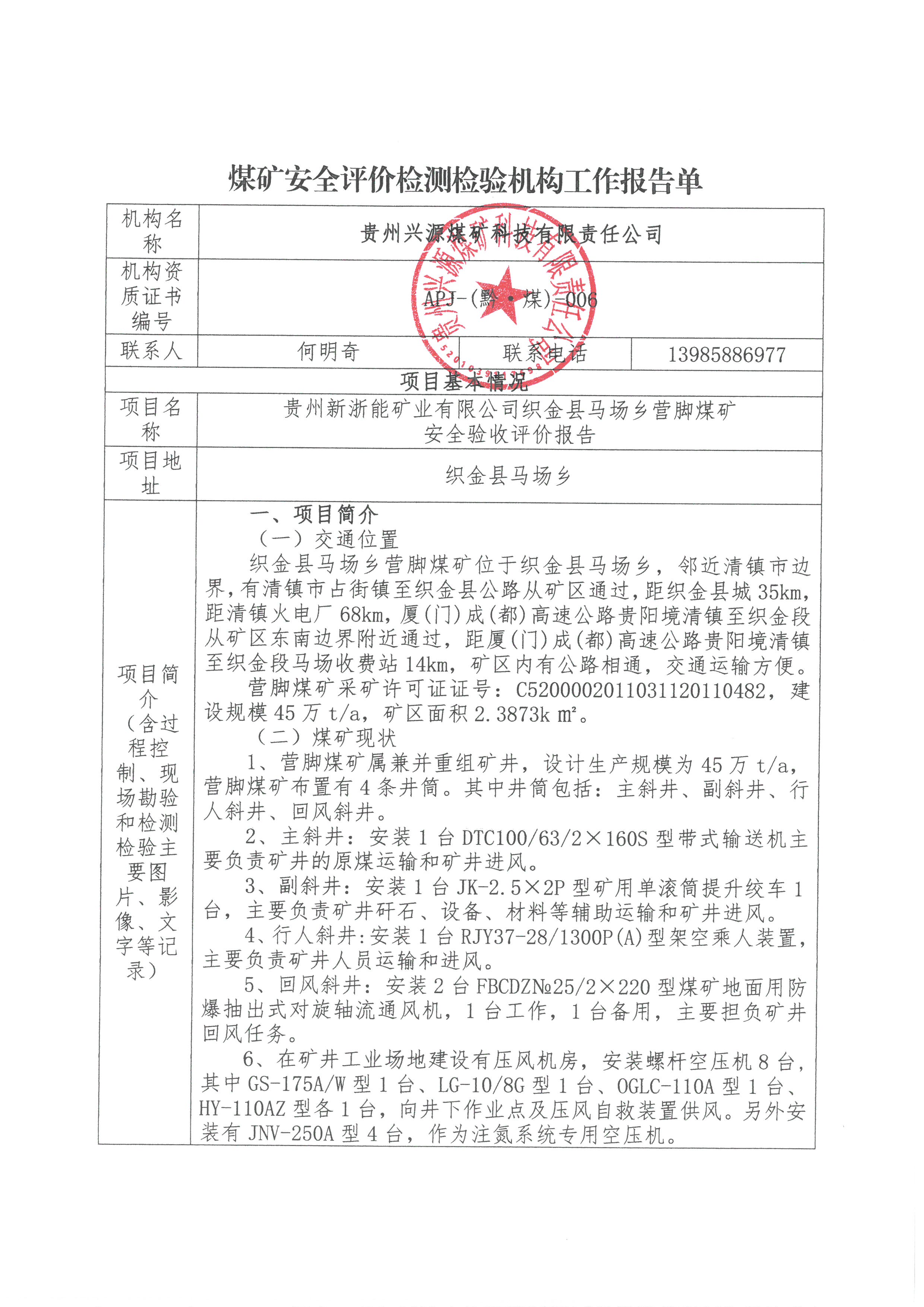 煤礦安全評價檢測檢驗機構(gòu)工作報告單【貴州新浙能礦業(yè)有限公司織金縣馬場鄉(xiāng)營腳煤礦安全驗收評價報告】