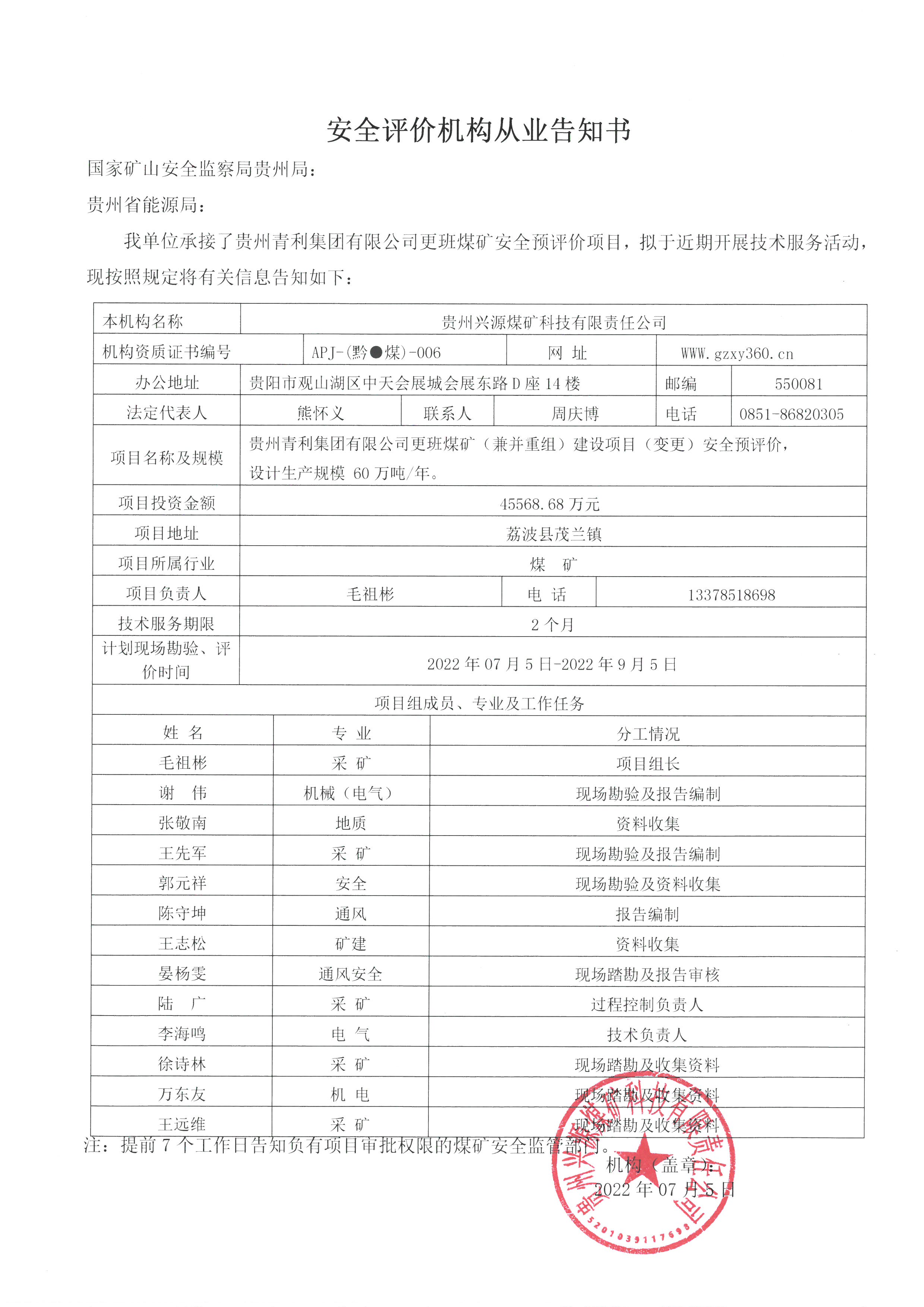 安全評價機構(gòu)從業(yè)告知書【貴州青利集團有限公司更班煤礦】