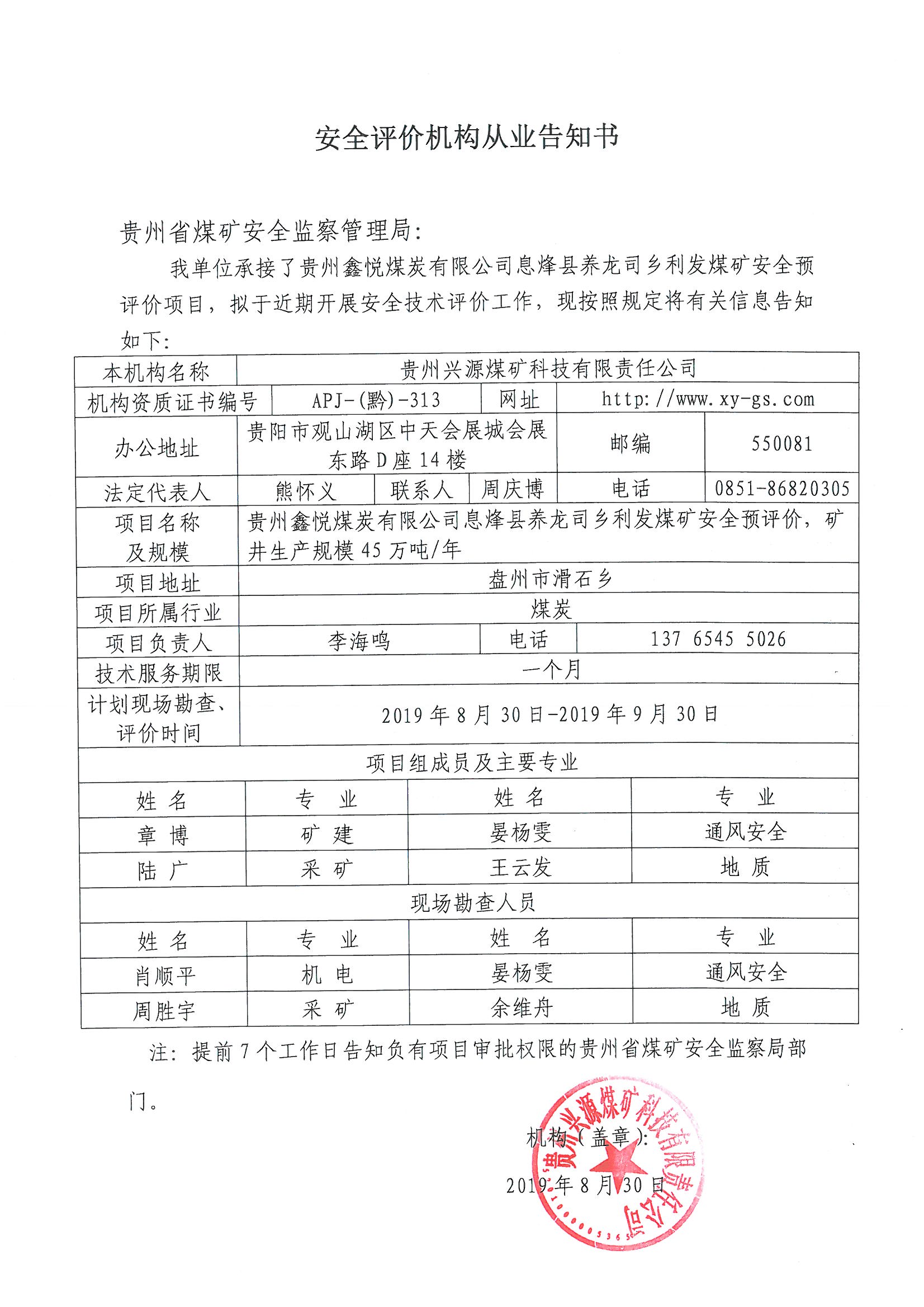 安全評(píng)價(jià)機(jī)構(gòu)從業(yè)告知書(shū)【貴州鑫悅煤炭有限公司息烽縣養(yǎng)龍司鄉(xiāng)利發(fā)煤礦】
