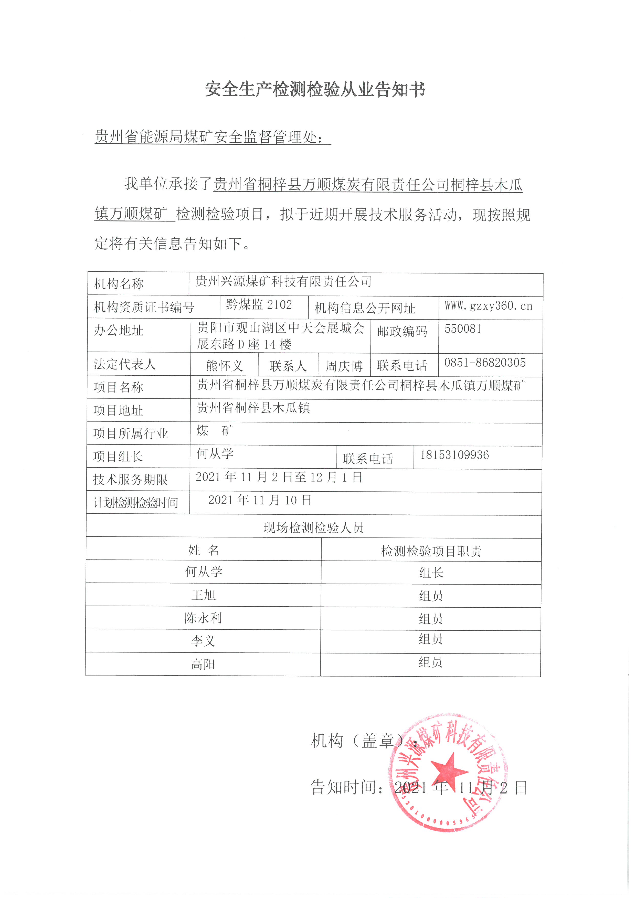 安全生產(chǎn)檢測(cè)檢驗(yàn)從業(yè)告知書(shū)【貴州省桐梓縣萬(wàn)順煤炭有限責(zé)任公司桐梓縣木瓜鎮(zhèn)萬(wàn)順煤礦】
