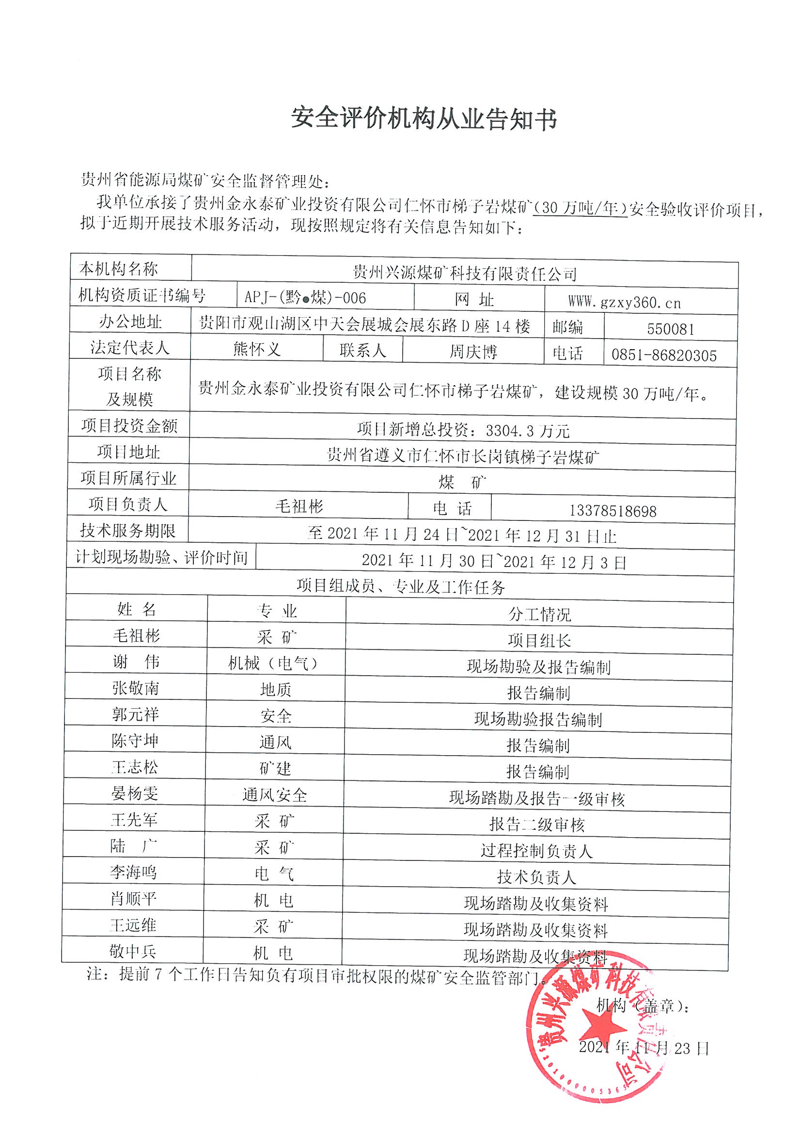 安全評(píng)價(jià)機(jī)構(gòu)從業(yè)告知書(貴州金永泰礦業(yè)投資有限公司仁懷市梯子巖煤礦(30萬噸/ 年)安全驗(yàn)收評(píng)價(jià))
