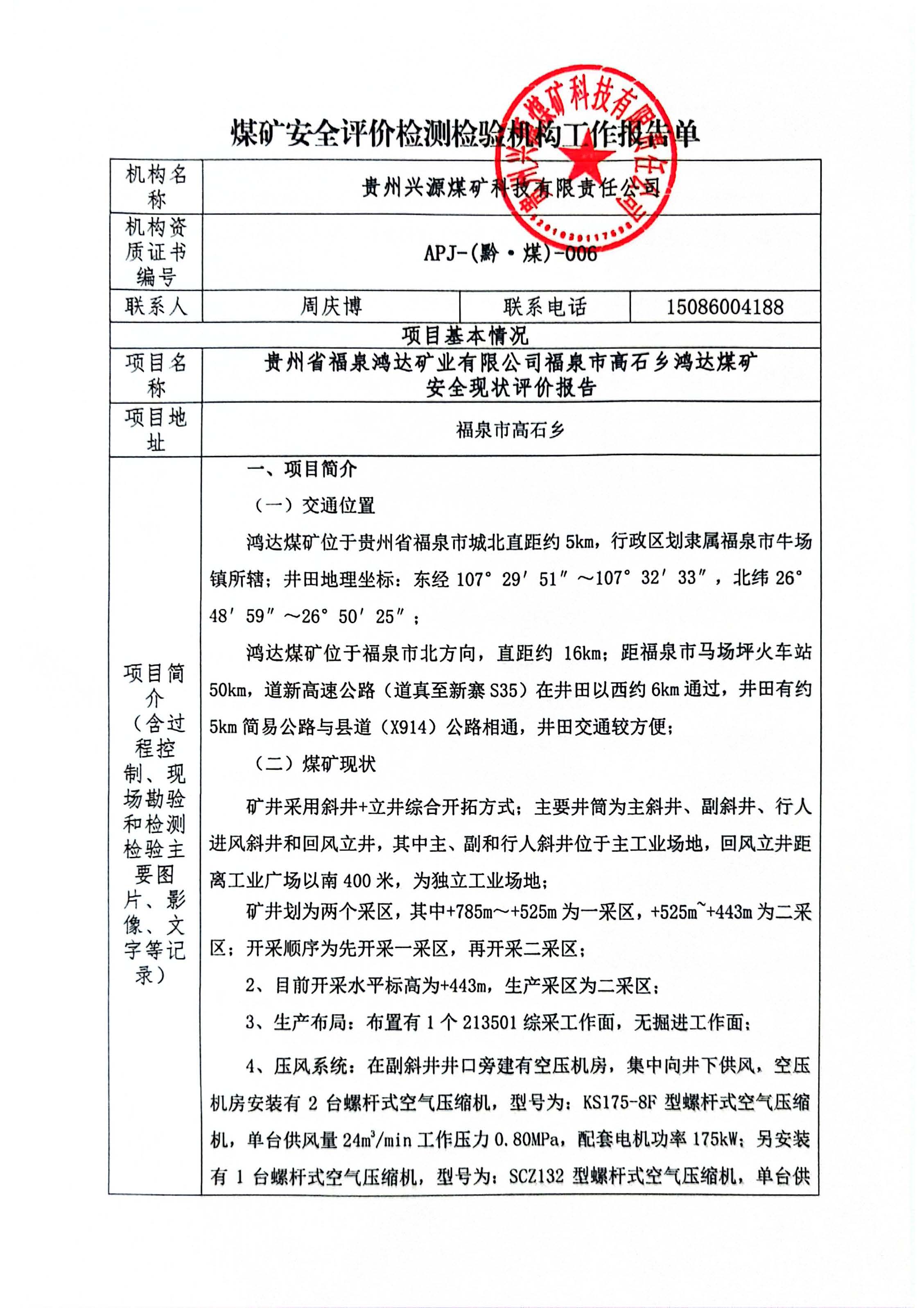 煤礦安全評(píng)價(jià)檢測(cè)檢驗(yàn)機(jī)構(gòu)工作報(bào)告單[貴州省福泉鴻達(dá)礦業(yè)有限公司福泉市高石鄉(xiāng)鴻達(dá)煤礦 安全現(xiàn)狀評(píng)價(jià)報(bào)告]