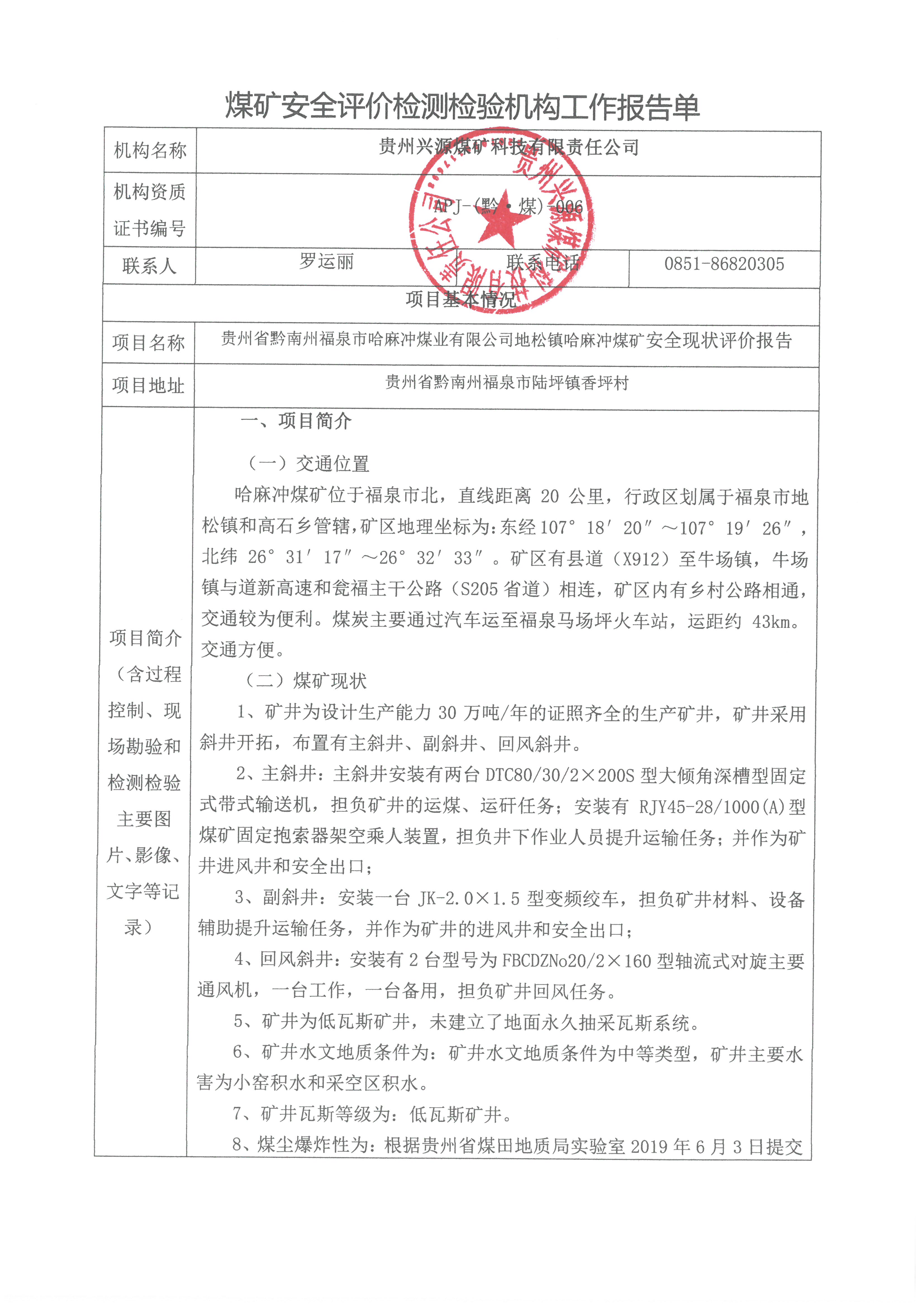 煤礦安全評(píng)價(jià)檢測(cè)檢驗(yàn)機(jī)構(gòu)工作報(bào)告單【貴州省黔南州福泉市哈麻沖煤業(yè)有限公司地松鎮(zhèn)哈麻沖煤礦安全現(xiàn)狀評(píng)價(jià)報(bào)告】
