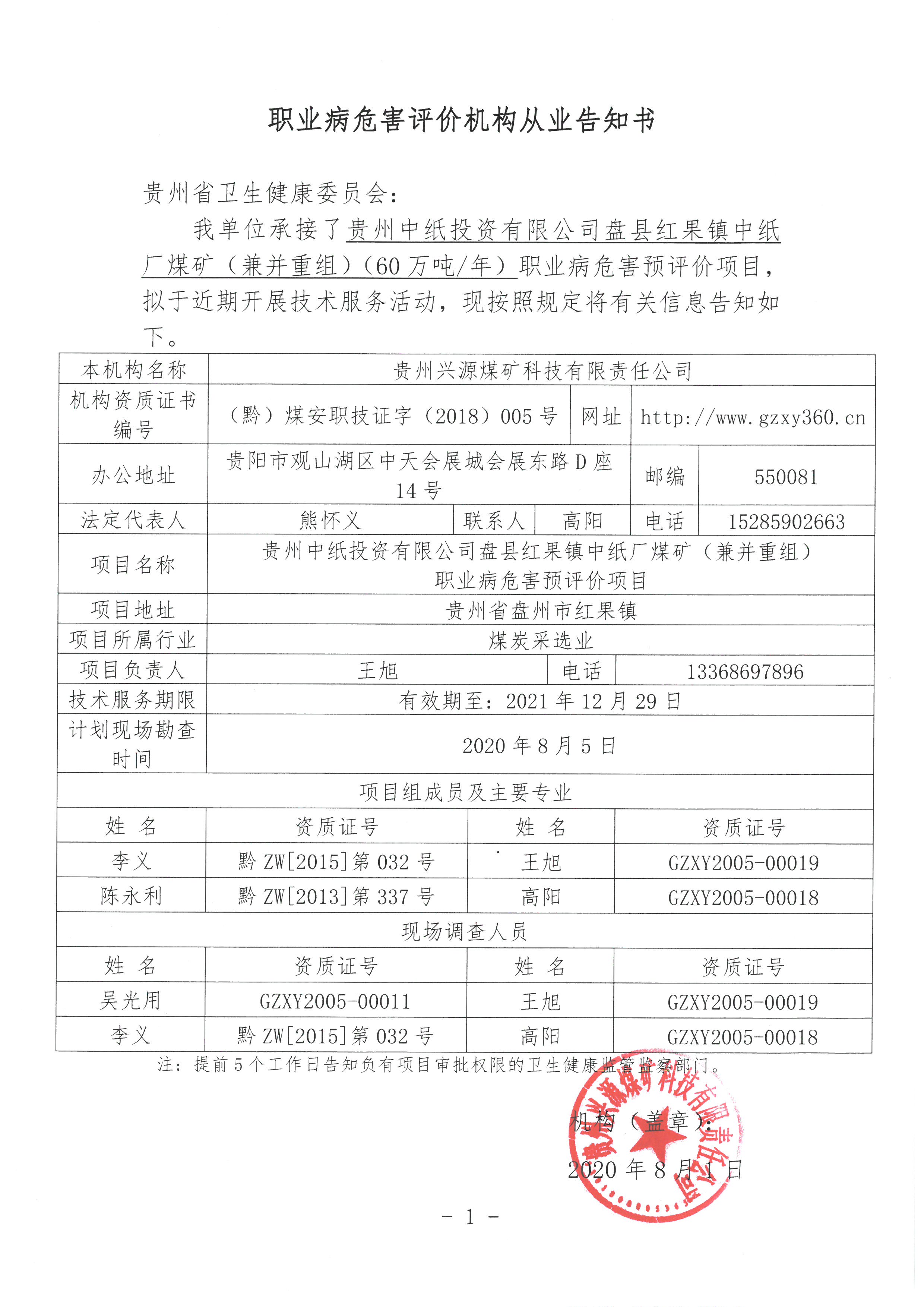 職業(yè)病危害評價機構從業(yè)告知書【貴州中紙投資有限公司盤縣紅果鎮(zhèn)中紙廠煤礦(兼并重組)】