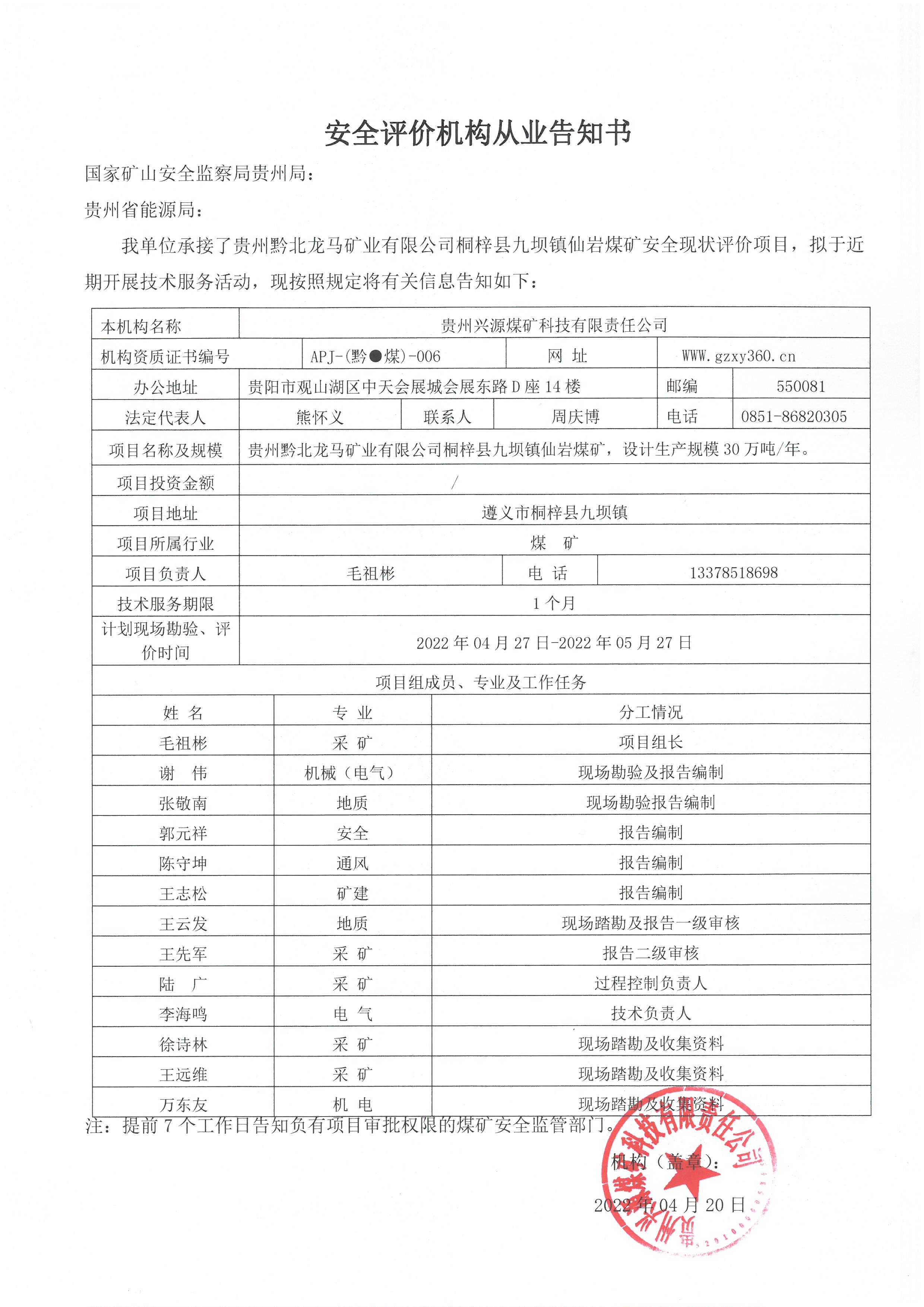 安全評價機構從業(yè)告知書(貴州黔北龍馬礦業(yè)有限公司桐梓縣九壩鎮(zhèn)仙巖煤礦安全現(xiàn)狀評價項目)