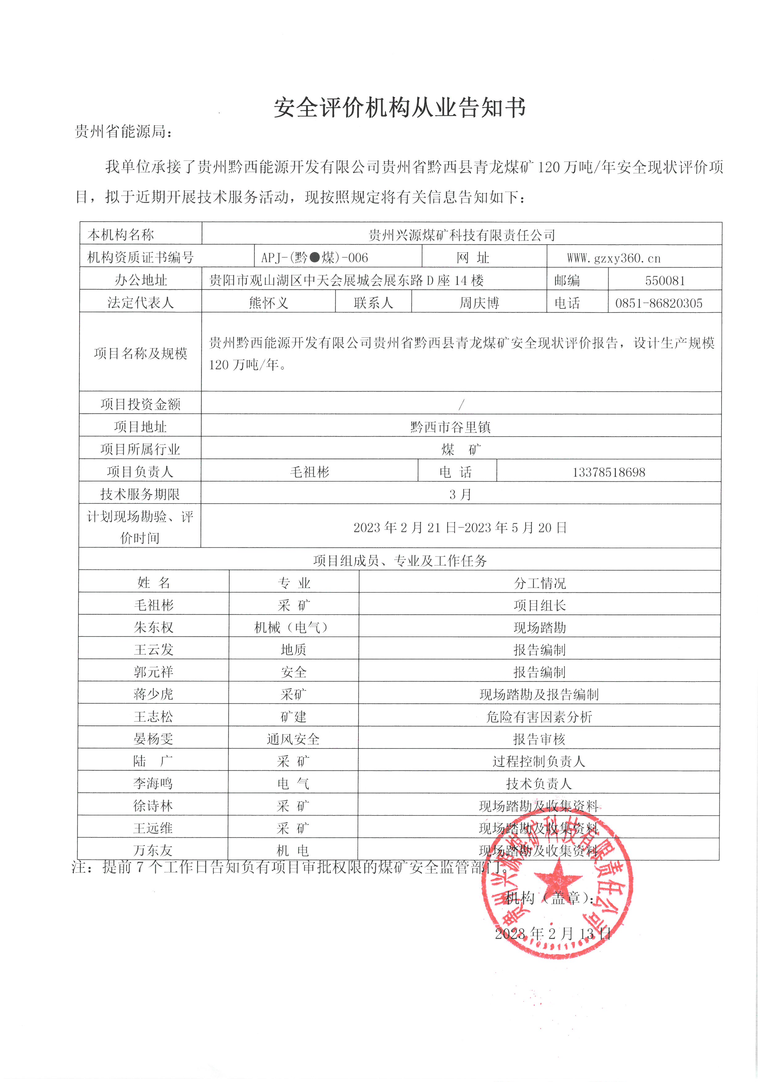 安全評價機構從業(yè)告知書(貴州黔西能源開發(fā)有限公司貴州省黔西縣青龍煤礦)