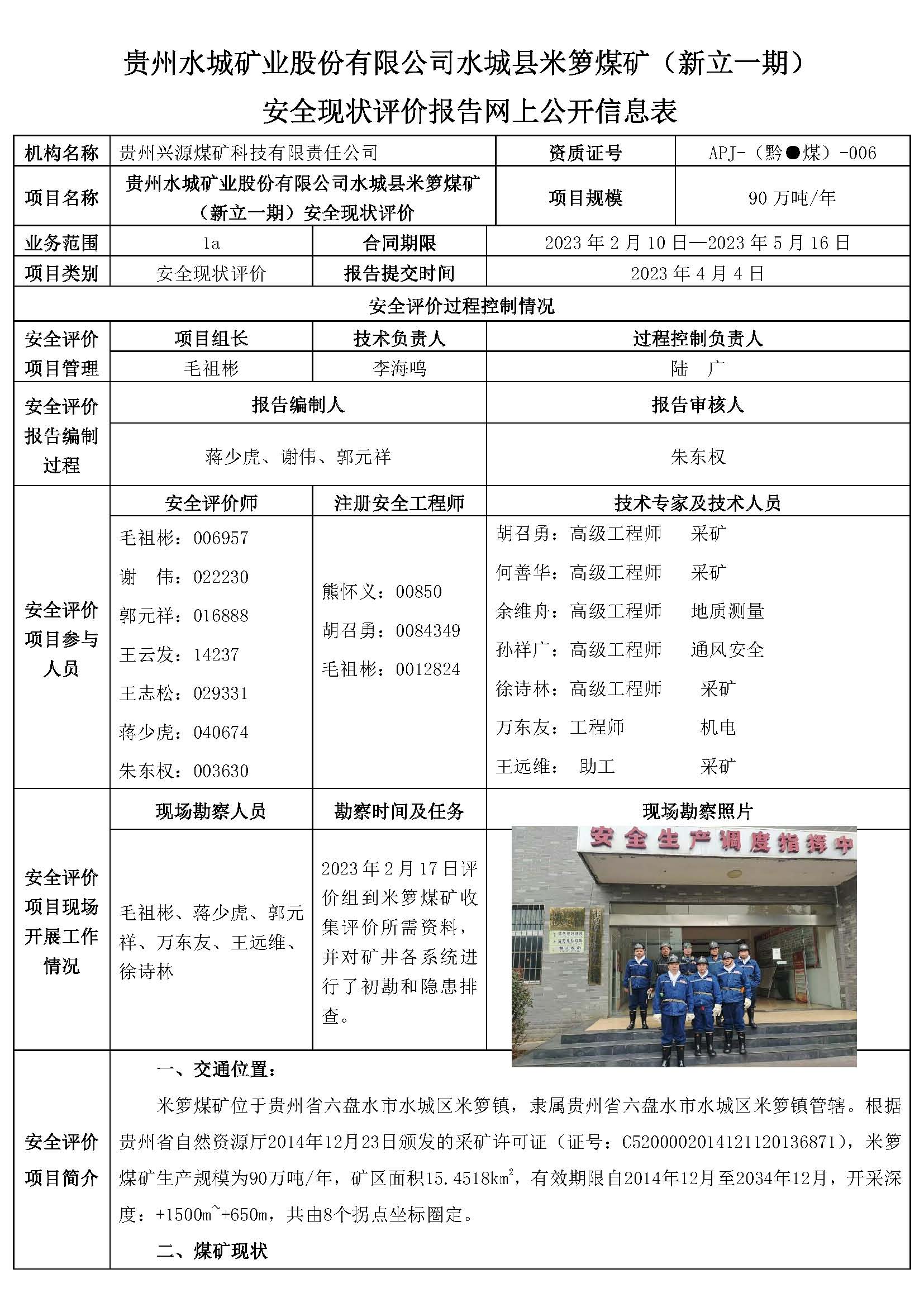 貴州水城礦業(yè)股份有限公司水城縣米籮煤礦(新立一期) 安全現(xiàn)狀評價報告網(wǎng)上公開信息表