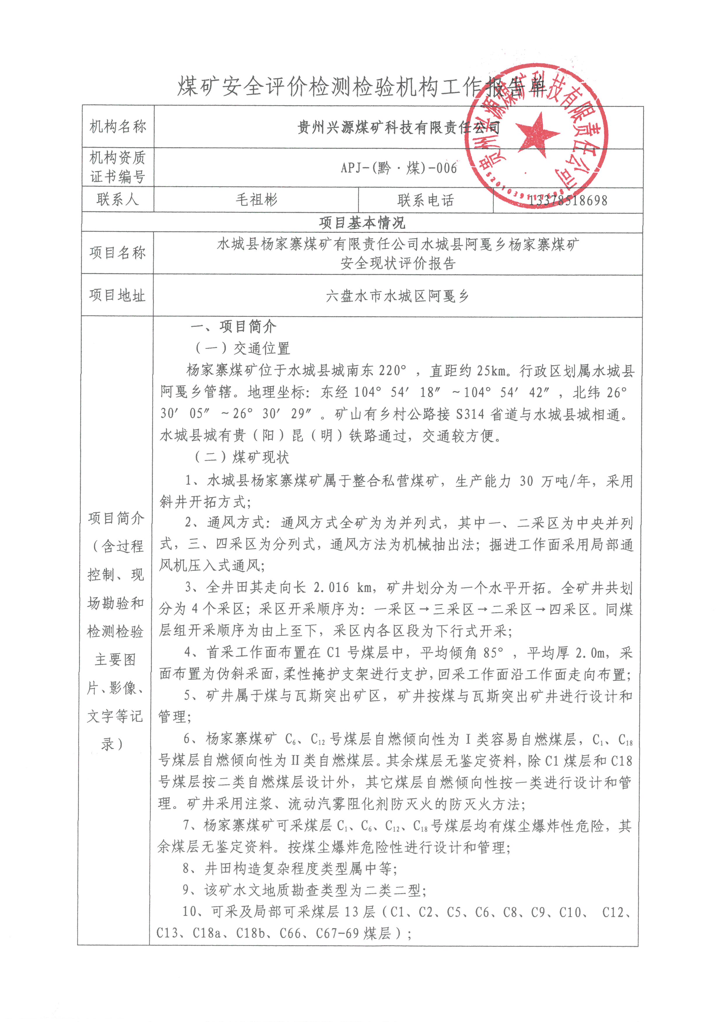 煤礦安全評價檢測檢驗機(jī)構(gòu)工作報告單【水城縣楊家寨煤礦有限責(zé)任公司水城縣阿戛鄉(xiāng)楊家寨煤礦安全現(xiàn)狀評價報告】