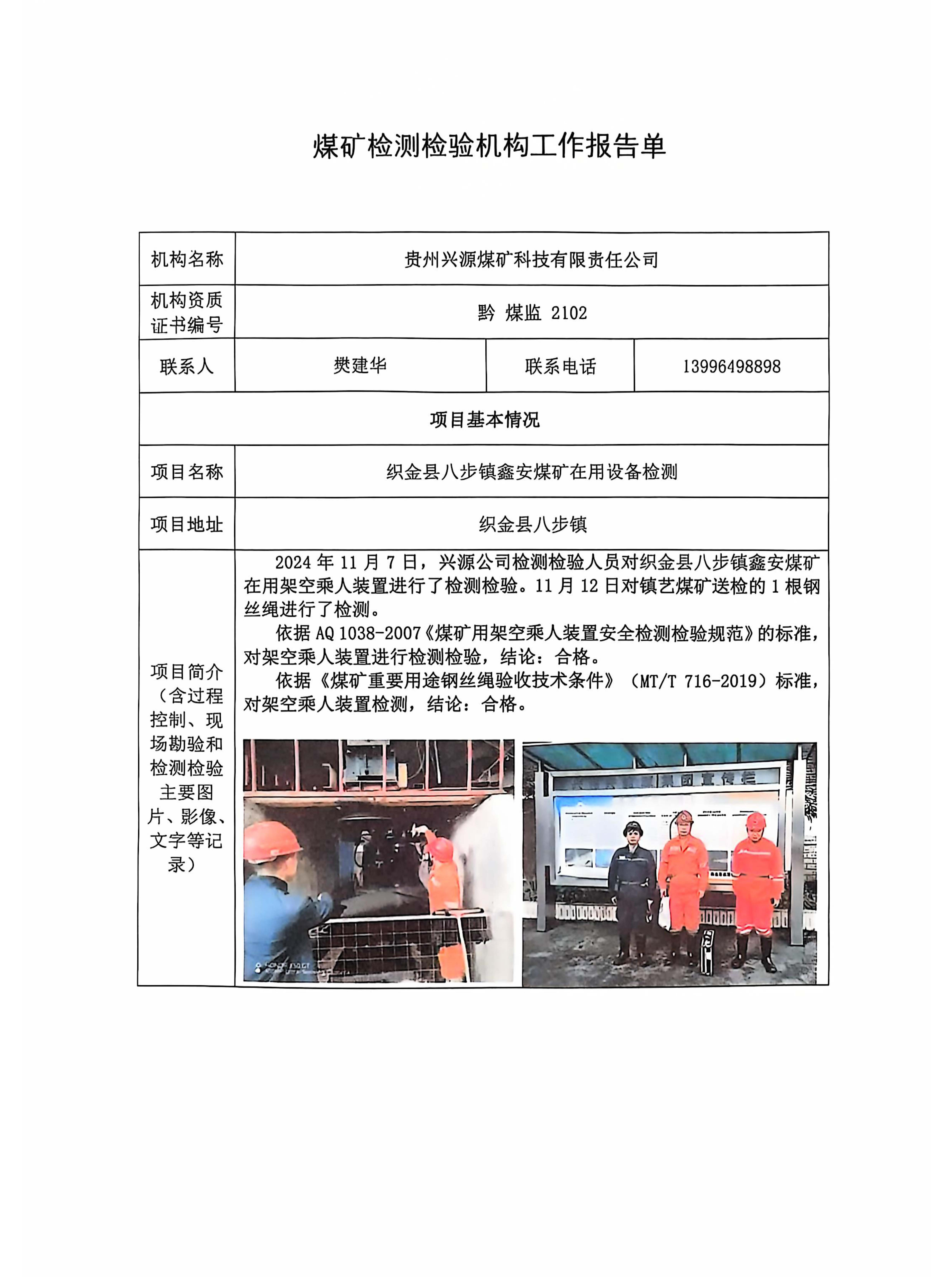煤礦檢測檢驗(yàn)機(jī)構(gòu)工作報(bào)告單【織金縣八步鎮(zhèn)鑫安煤礦在用設(shè)備檢測】