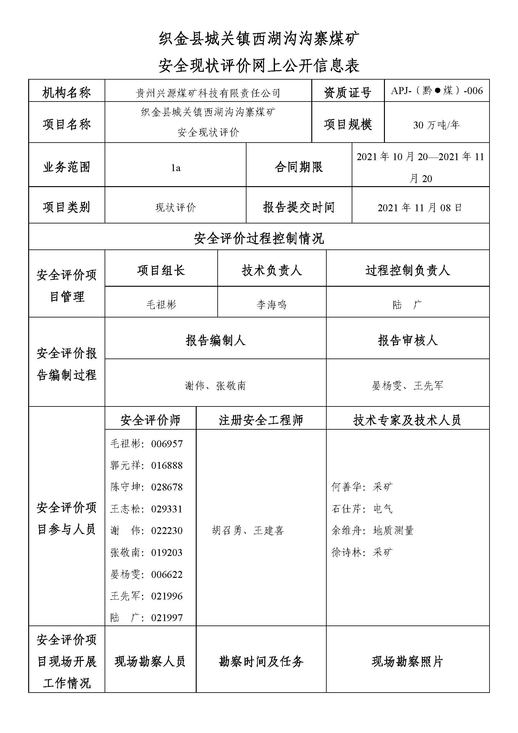 織金縣城關(guān)鎮(zhèn)西湖溝溝寨煤礦安全現(xiàn)狀評(píng)價(jià)網(wǎng)上公開(kāi)信息表