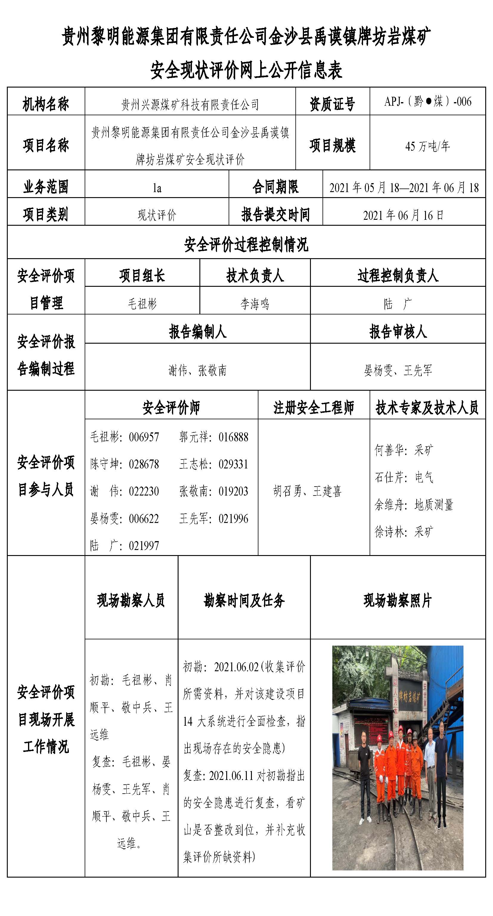 貴州黎明能源集團(tuán)有限責(zé)任公司金沙縣禹謨鎮(zhèn)牌坊巖煤礦安全現(xiàn)狀評(píng)價(jià)網(wǎng)上公開信息表