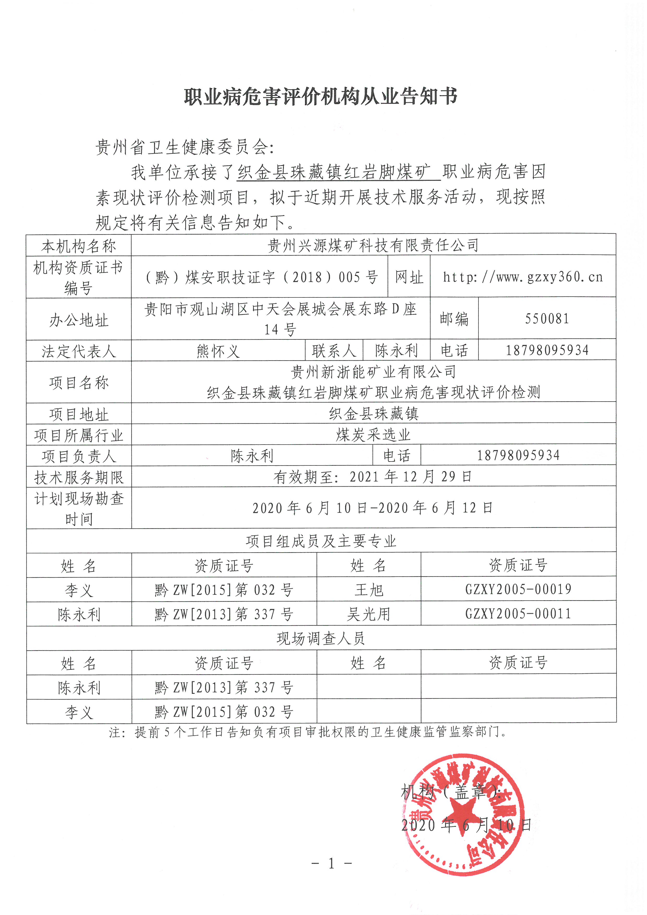職業(yè)病危害評(píng)價(jià)機(jī)構(gòu)從業(yè)告知書[織金縣珠藏鎮(zhèn)紅巖腳煤礦]