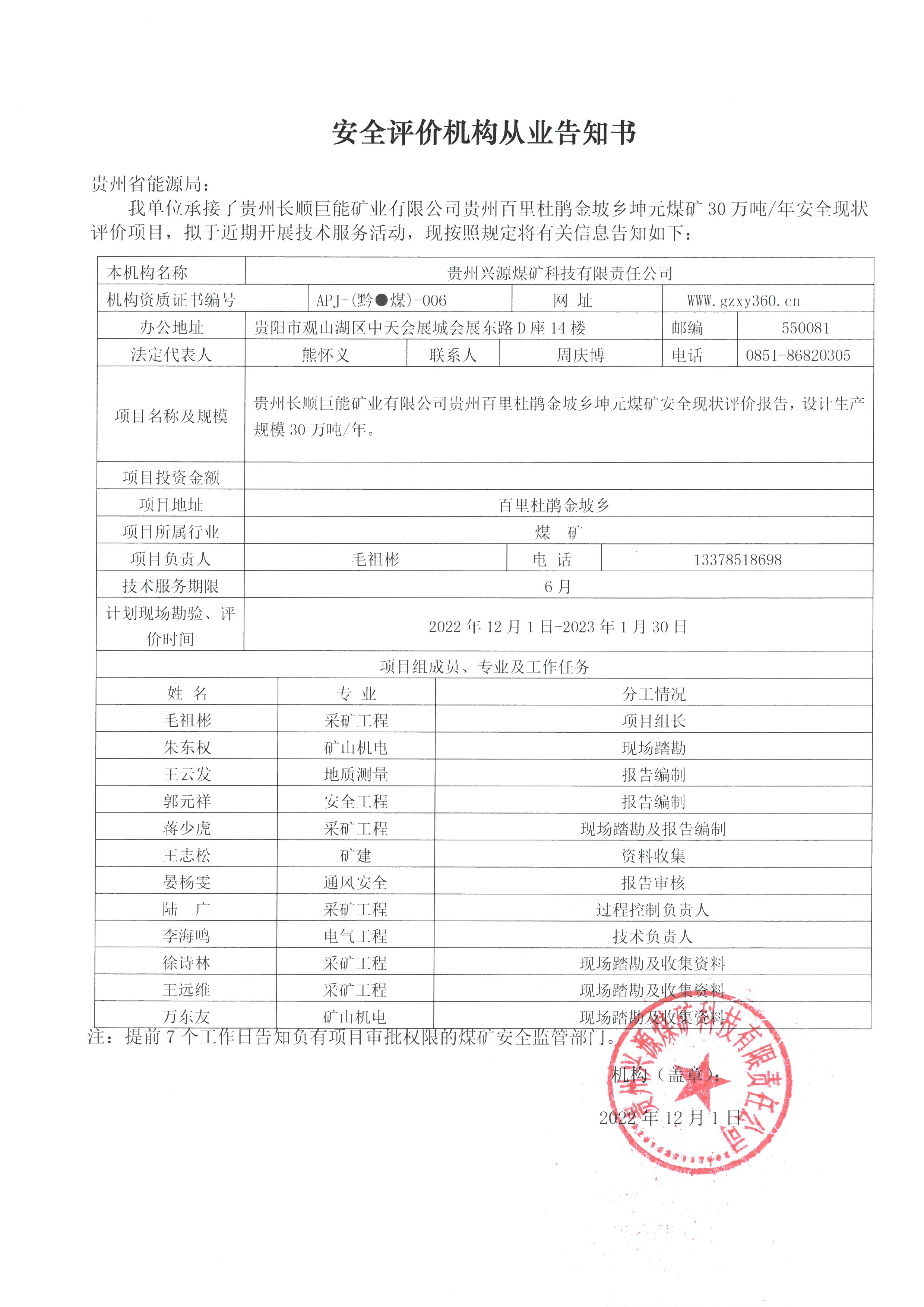 安全評(píng)價(jià)機(jī)構(gòu)從業(yè)告知書【貴州長順巨能礦業(yè)有限公司貴州百里杜鵑金坡鄉(xiāng)坤元煤礦】