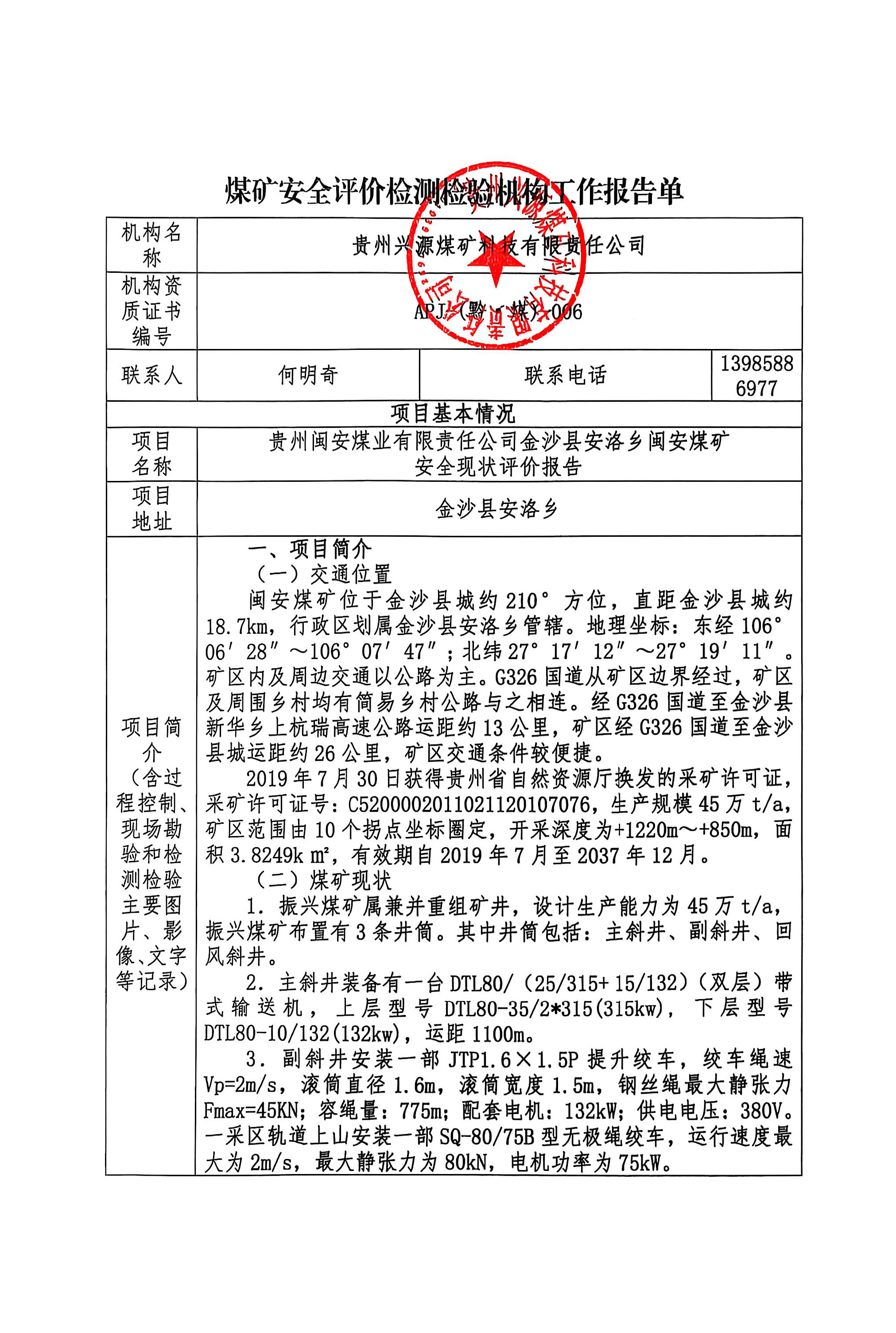 煤礦安全評(píng)價(jià)檢測(cè)檢驗(yàn)機(jī)構(gòu)工作報(bào)告單【貴州閩安煤業(yè)有限責(zé)任公司金沙縣安洛鄉(xiāng)閩安煤礦安全現(xiàn)狀評(píng)價(jià)報(bào)告】