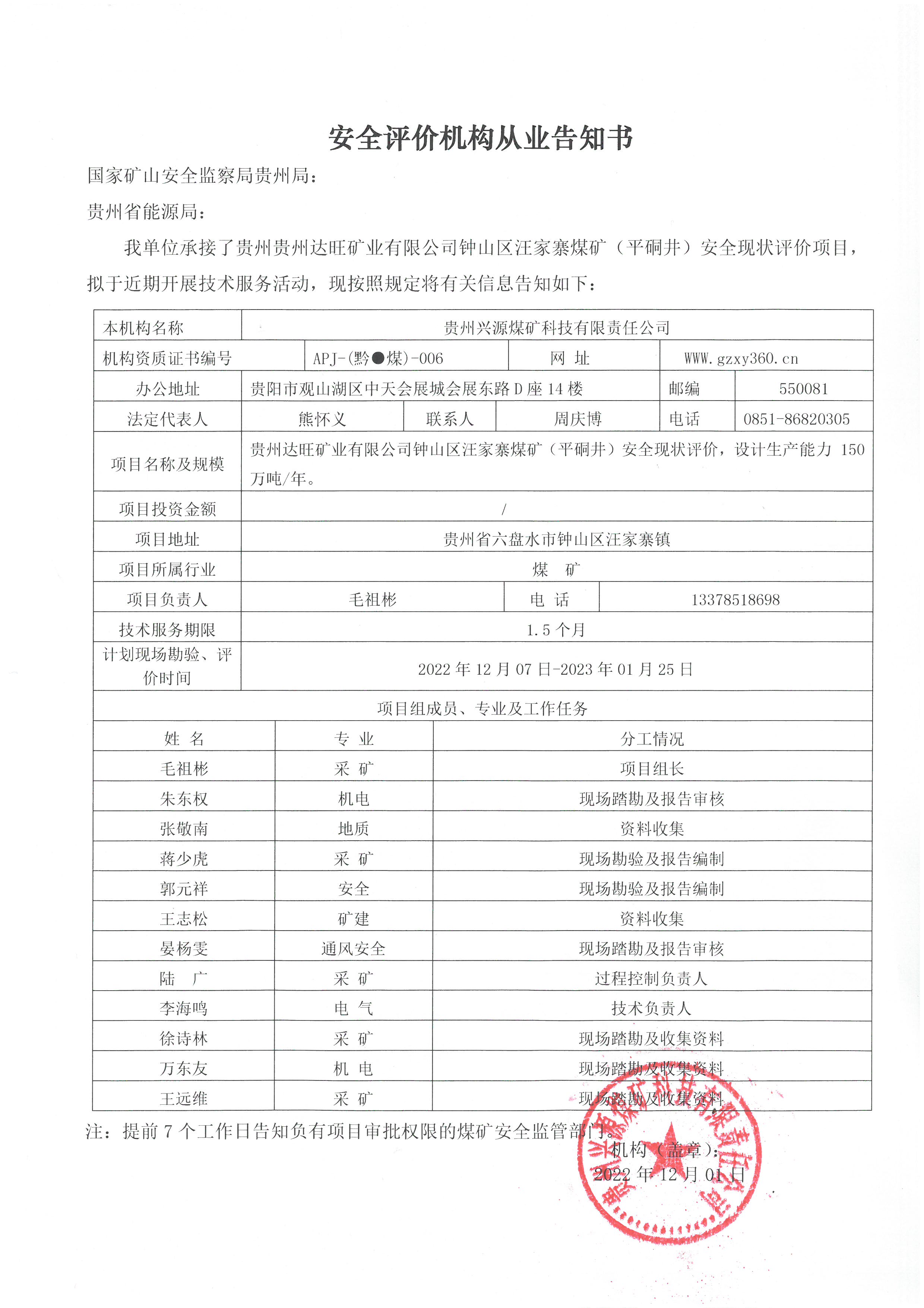 安全評價機(jī)構(gòu)從業(yè)告知書【貴州貴州達(dá)旺礦業(yè)有限公司鐘山區(qū)汪家寨煤礦(平硐井)安全現(xiàn)狀評價項目】