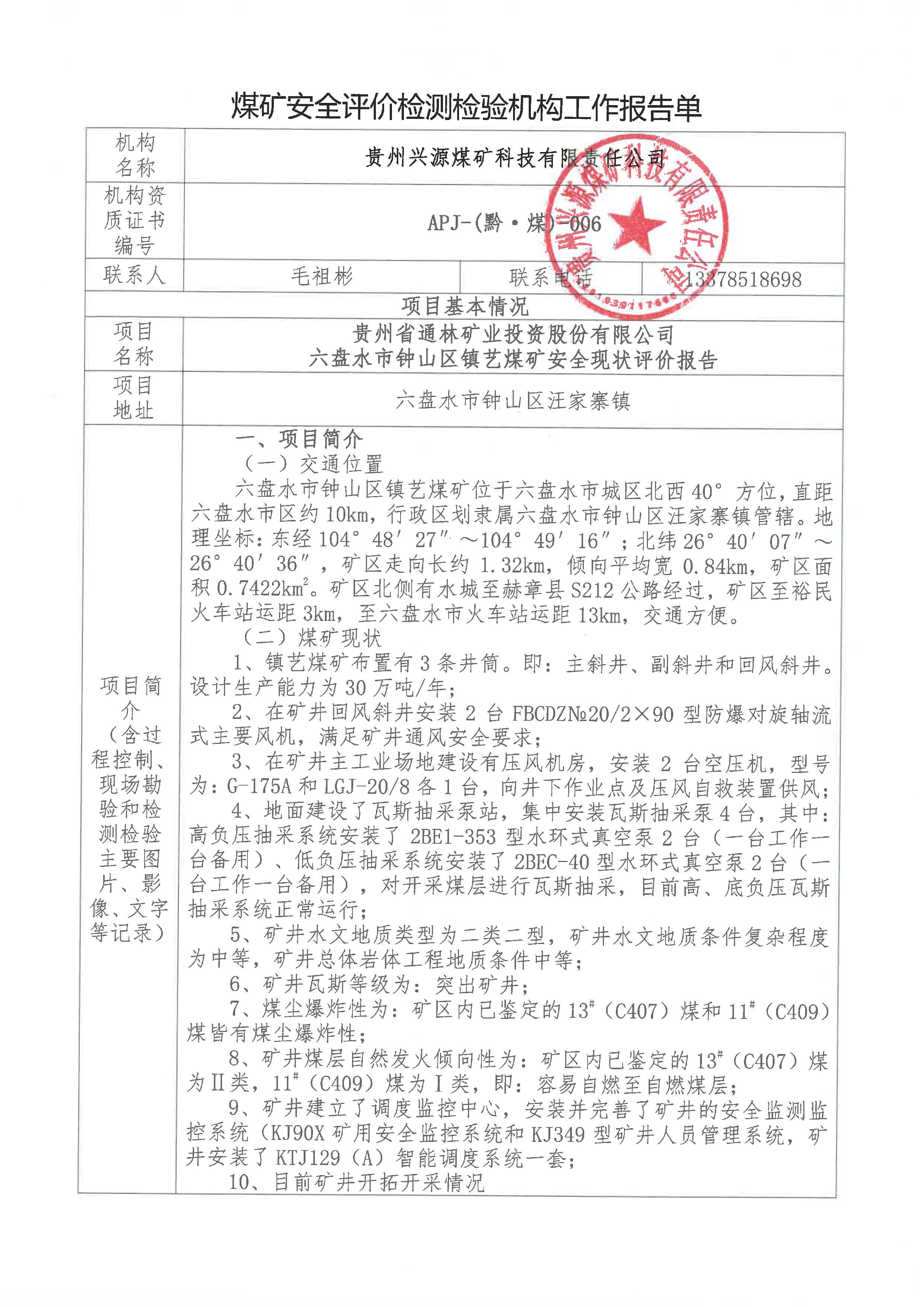煤礦安全評價檢測檢驗機(jī)構(gòu)工作報告單【貴州省通林礦業(yè)投資股份有限公司 六盤水市鐘山區(qū)鎮(zhèn)藝煤礦安全現(xiàn)狀評價報告】
