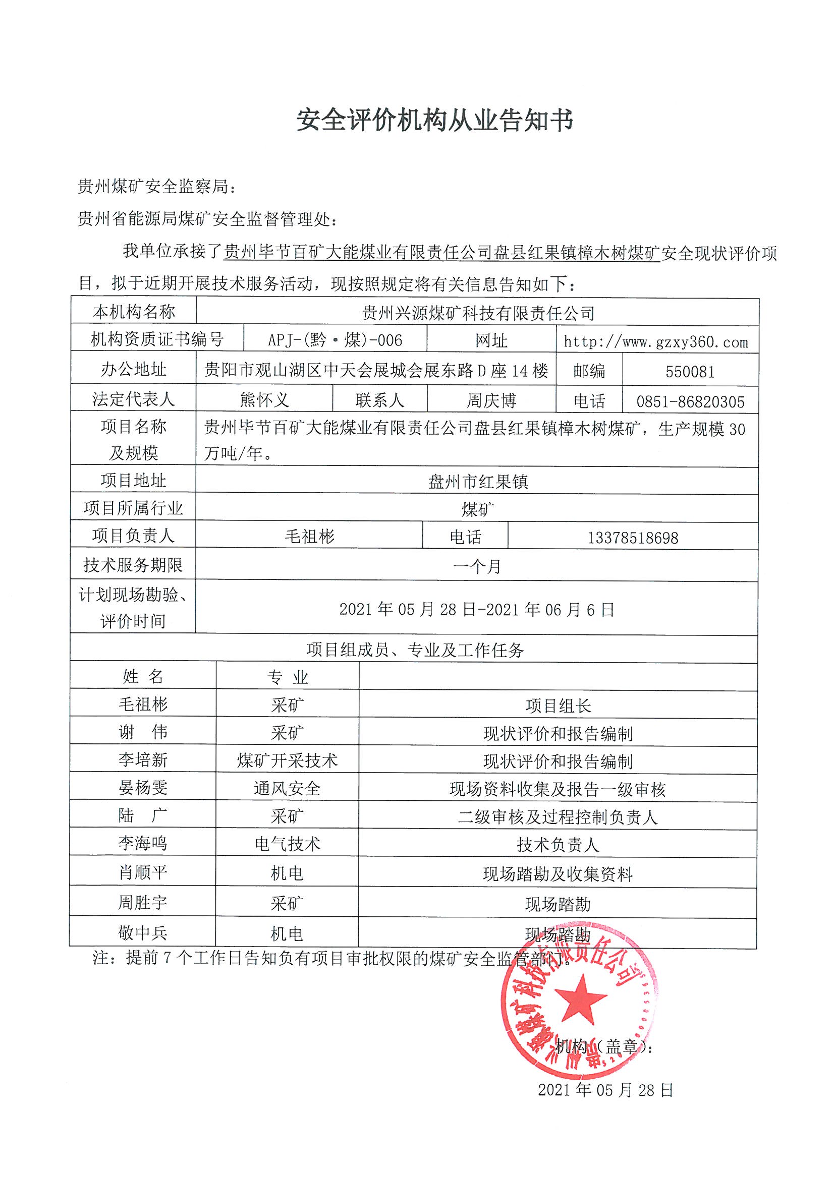 安全評價機構(gòu)從業(yè)告知書(貴州畢節(jié)百礦大能煤業(yè)有限責(zé)任公司盤縣紅果鎮(zhèn)樟木樹煤礦安全現(xiàn)狀評價)