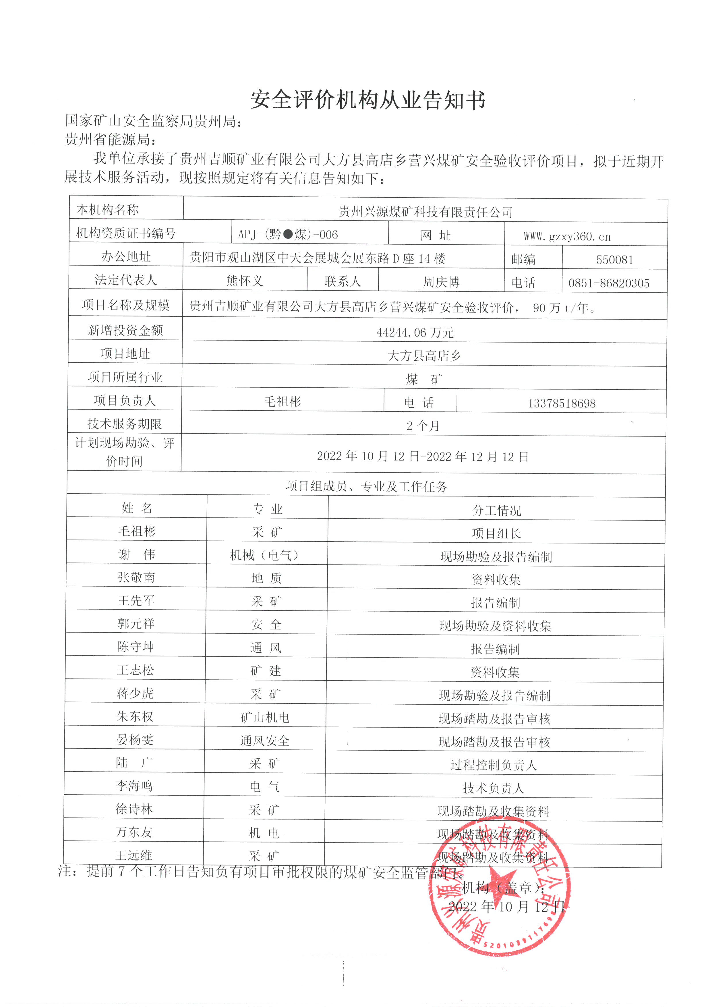 安全評價機構(gòu)從業(yè)告知書【貴州吉順礦業(yè)有限公司大方縣高店鄉(xiāng)營興煤礦安全驗收評價項目】
