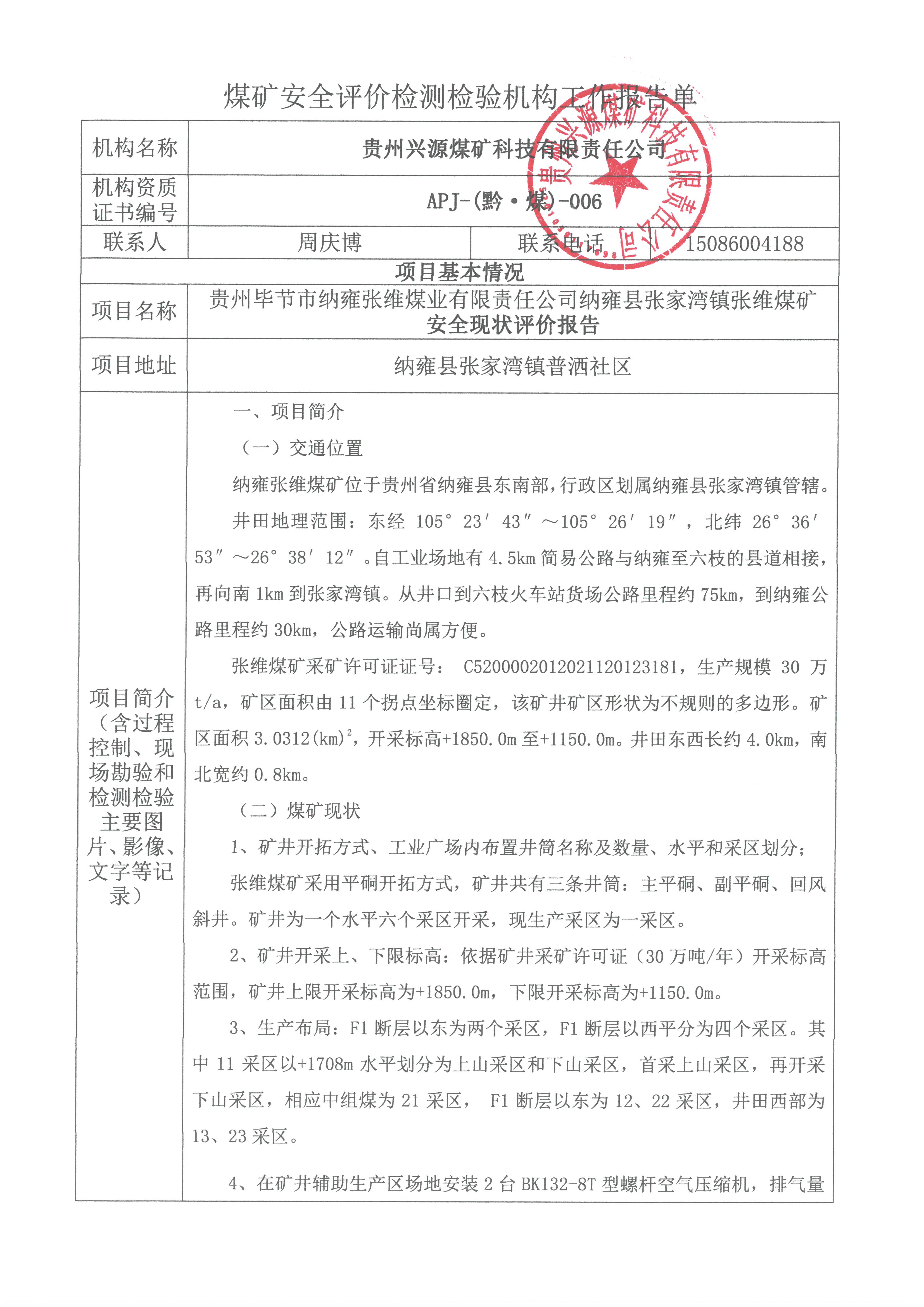 煤礦安全評(píng)價(jià)檢測檢驗(yàn)機(jī)構(gòu)工作報(bào)告單貴州畢節(jié)市納雍張維煤業(yè)有限責(zé)任公司納雍縣張家灣鎮(zhèn)張維煤礦安全現(xiàn)狀評(píng)價(jià)報(bào)告
