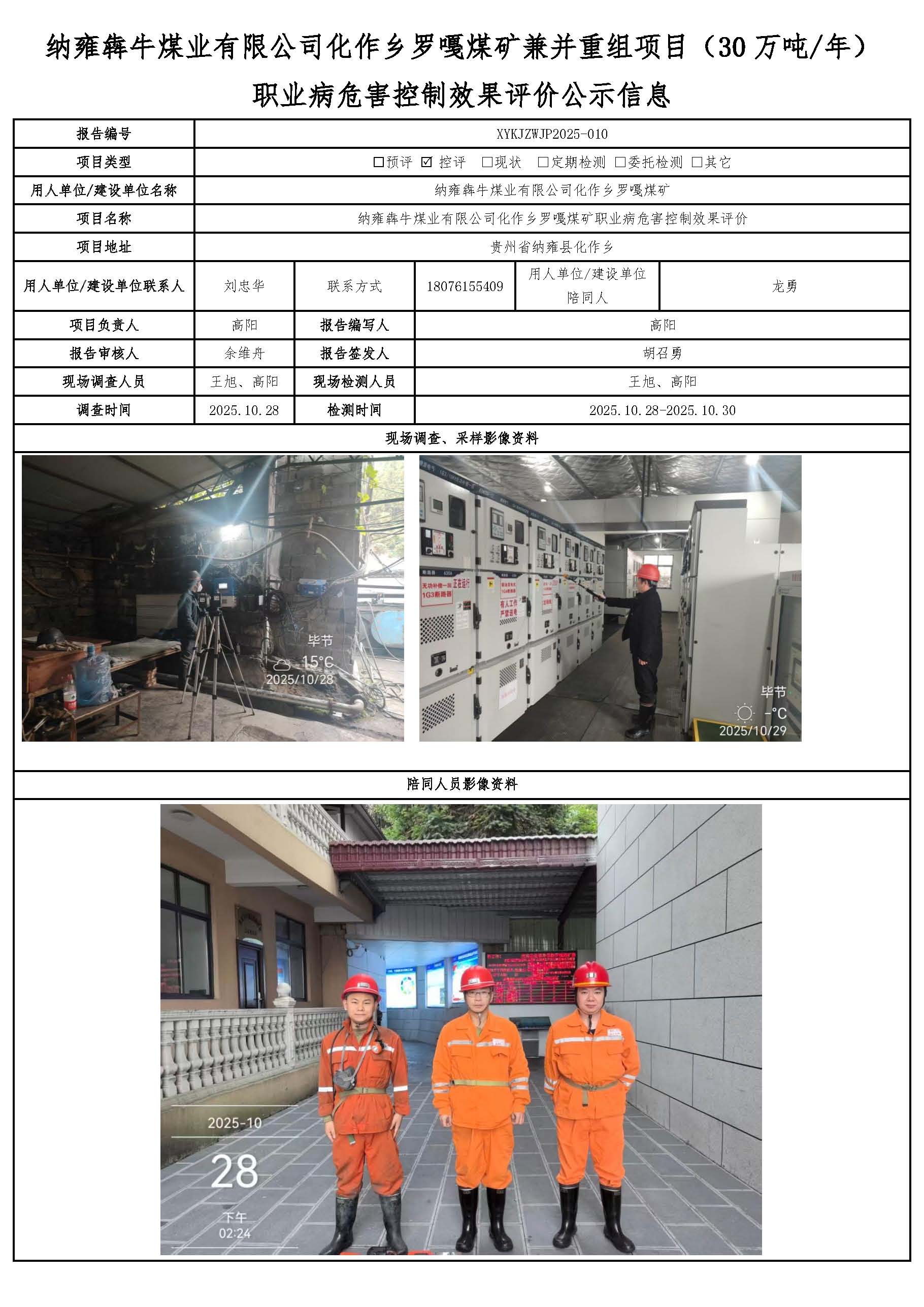 納雍犇牛煤業(yè)有限公司化作鄉(xiāng)羅嘎煤礦兼并重組項目(30萬噸/年)職業(yè)病危害控制效果評價公示信息