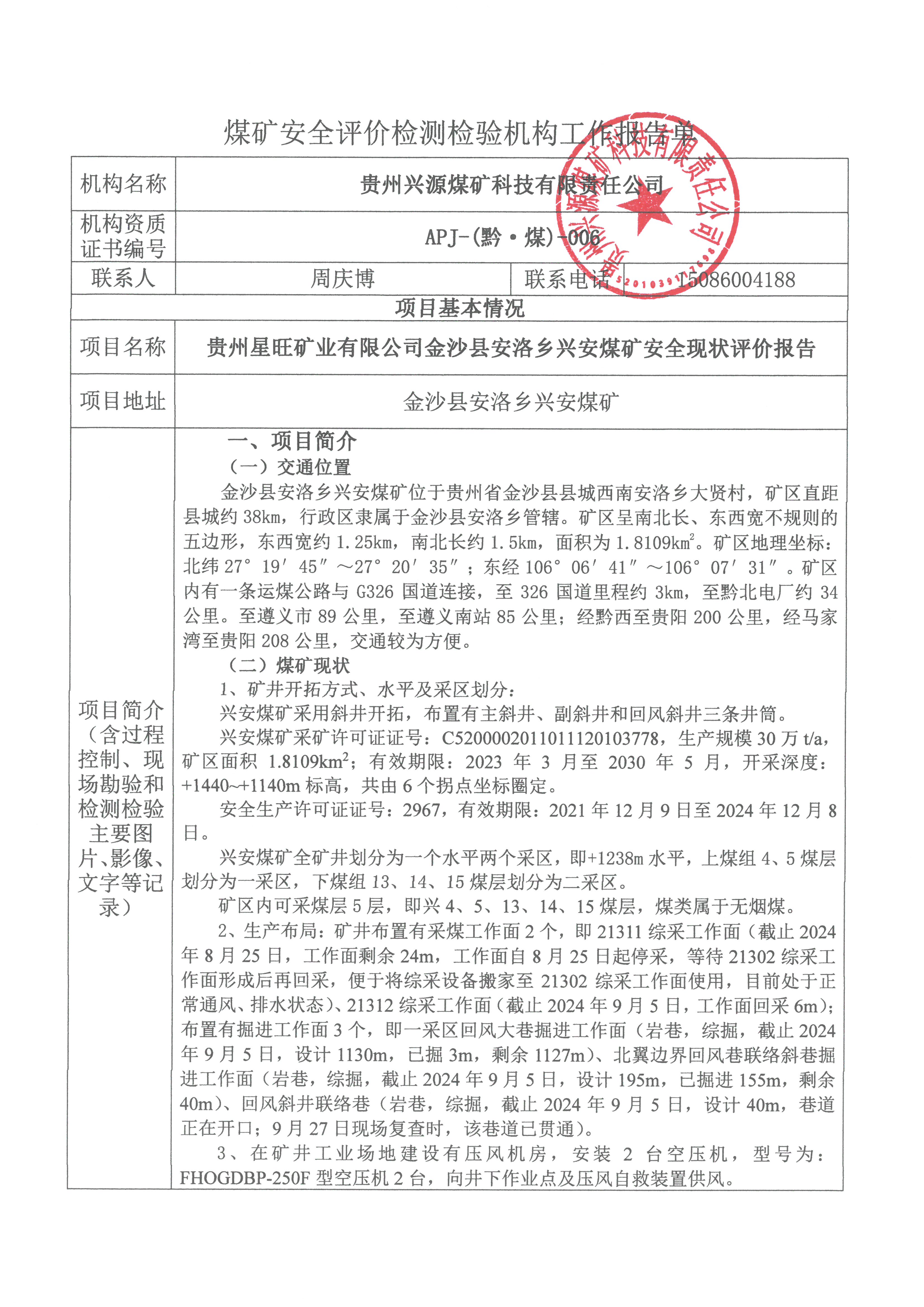 煤礦安全評(píng)價(jià)檢測(cè)檢驗(yàn)機(jī)構(gòu)工作報(bào)告單【貴州星旺礦業(yè)有限公司金沙縣安洛鄉(xiāng)興安煤礦安全現(xiàn)狀評(píng)價(jià)報(bào)告】
