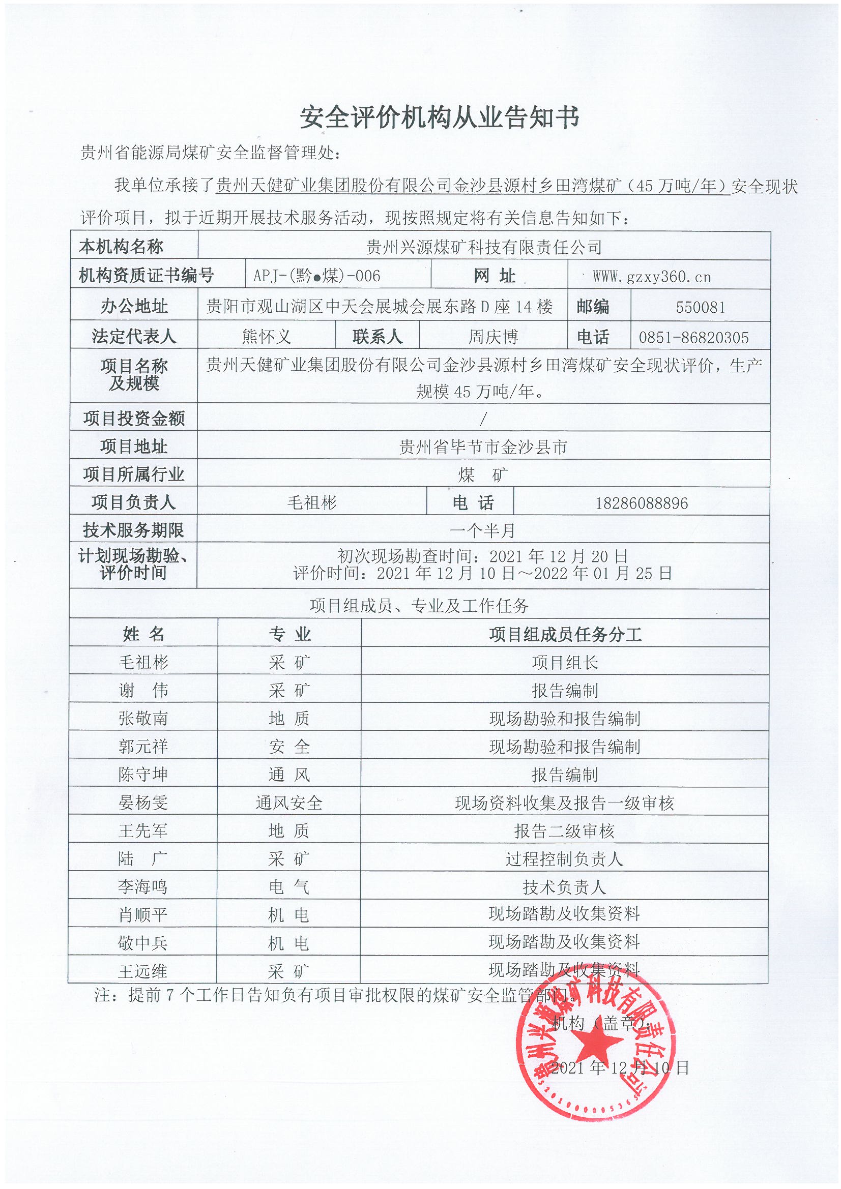 安全評價機構從業(yè)告知書(貴州天健礦業(yè)集團股份有限公司金沙縣源村鄉(xiāng)田灣煤礦(45萬噸/年)安全現(xiàn)狀評價)