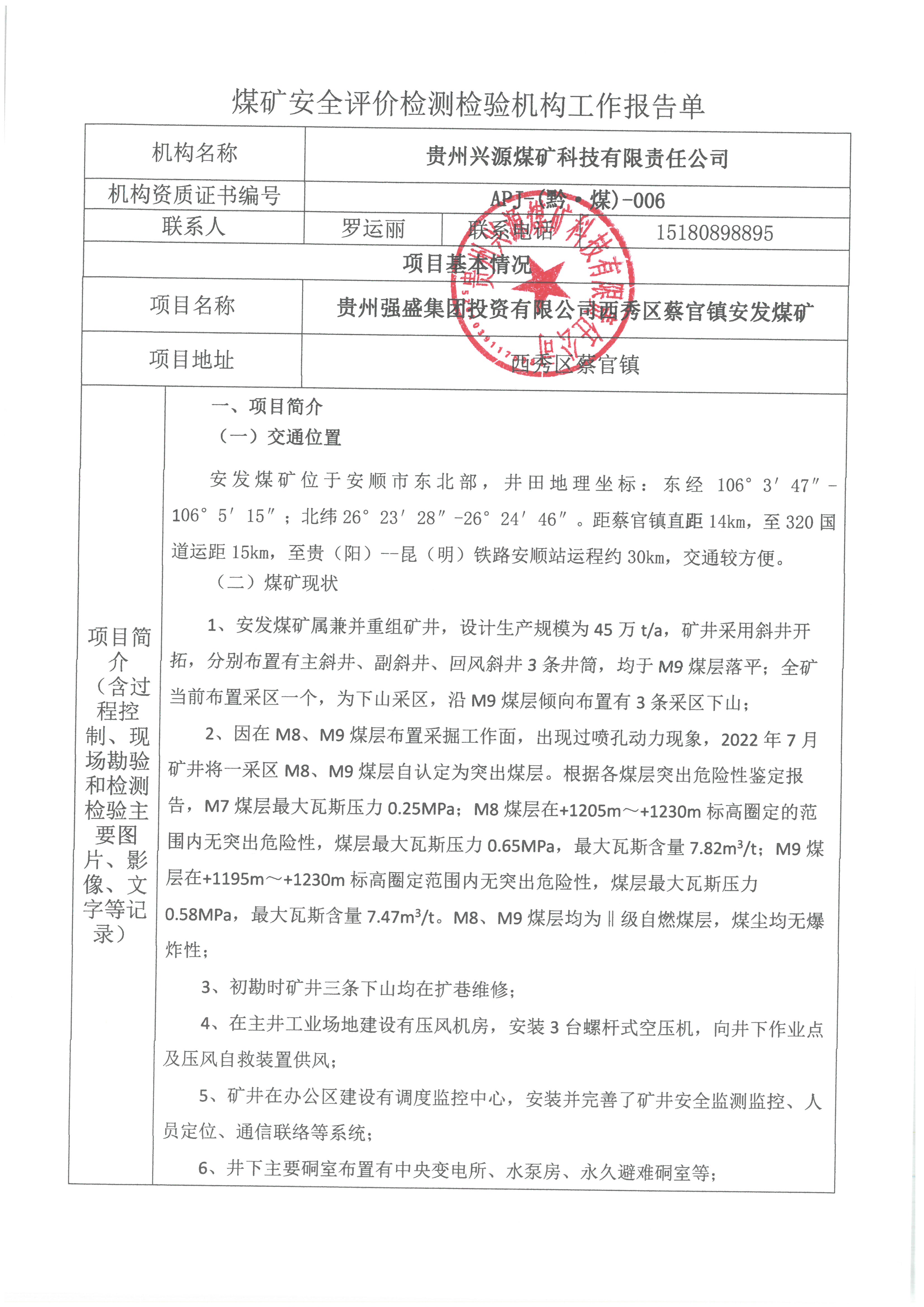 煤礦安全評價(jià)檢測檢驗(yàn)機(jī)構(gòu)工作報(bào)告單【貴州強(qiáng)盛集團(tuán)投資有限公司西秀區(qū)蔡官鎮(zhèn)安發(fā)煤礦】