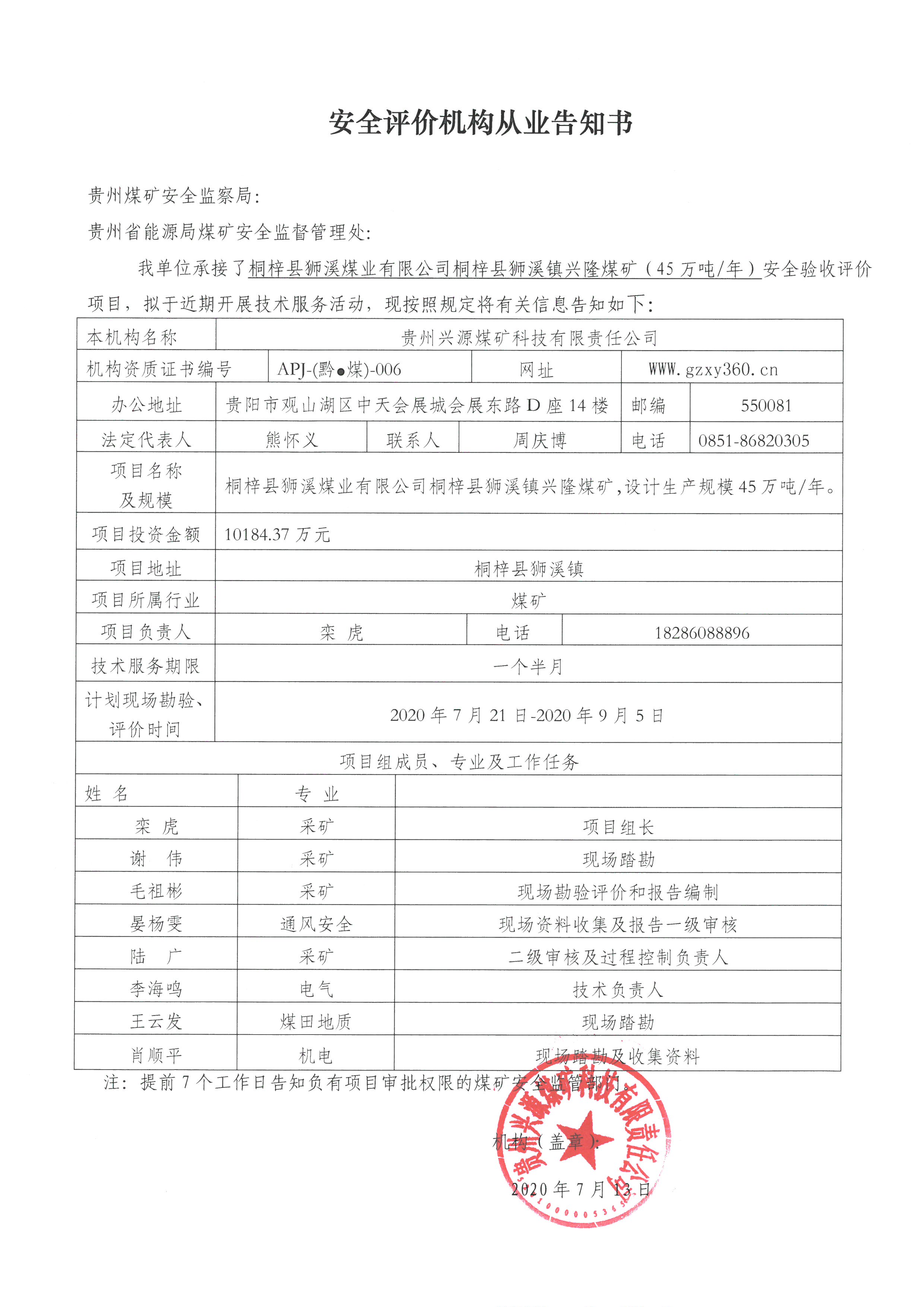 安全評(píng)價(jià)機(jī)構(gòu)從業(yè)告知書[桐梓縣獅溪煤業(yè)有限公司桐梓縣獅溪鎮(zhèn)興隆煤礦]